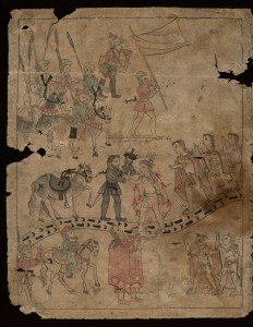 IMAGE 17: ‘Lienzo de Tlaxcala, Cortés greets Xicotencatl’, 1545-1555 CE. Current Location: Benson Latin American Collection, University of Texas, Austin. Description: “This scene depicts two famous alliances in the history of the Spanish conquest of the Aztecs. The first is between Xicotencatl, the head of the indigenous state of Tlaxcala, and Hernán Cortés, the leader of the Spanish conquistadors. The second alliance is that between Córtes and his translator, doña Marina, who appears in the center of the image.” Photo Credit: Benson Latin American Collection, University of Texas, Austin. Dana Leibsohn and Barbara E. Mundy, Vistas: Visual Culture in Spanish America, 1520-1820, Vistas Gallery.