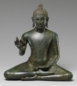 IMAGE 2: Buddha Expounding the Dharma, late 8th century. Sri Lanka (Anuradhapura). Copper alloy. Height: 10 1/2 in. (26.7 cm), Width: 11 in. (7.9 cm), Depth: 4 1/2 in. (11.4 cm). Accession Number: 2009.60. The Metropolitan Museum of Art, New York. Public Domain.