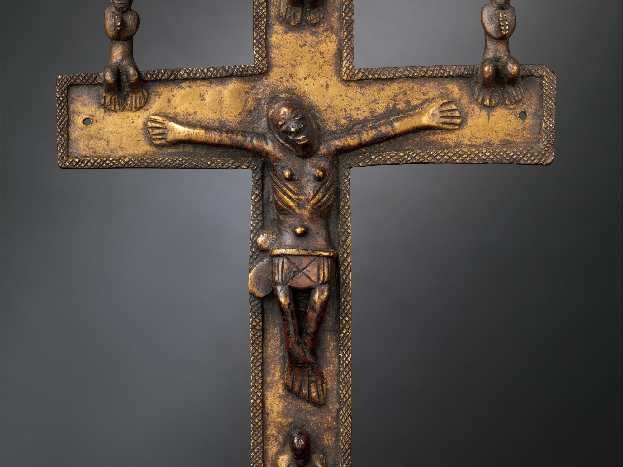 IMAGE 3: Crucifix, 16th–17th century. Kingdom of Kongo. Brass (solid cast); Height: 10 3/4 in. (27.3 cm). Width: 7 in (17.8 cm). Depth: 3/4 in. (1.9 cm). Accession Number: 1999.295.7. The Metropolitan Museum of Art, New York. Photograph by Peter Zeray. Public Domain.