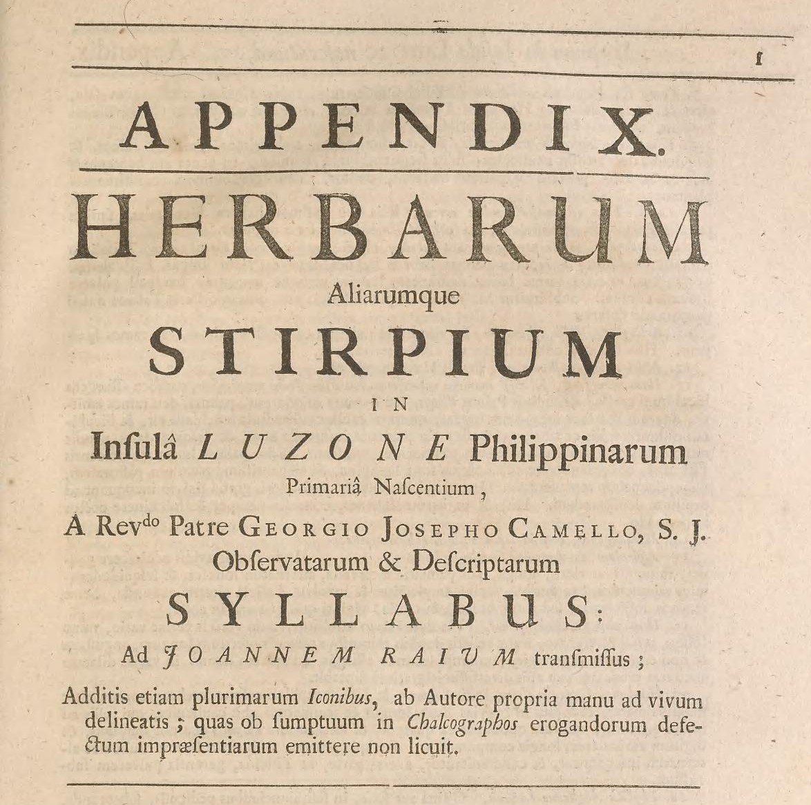 IMAGE 3: Part of the first page of Georg Joseph Kamel’s ‘Appendix’ to John Ray, Historia plantarum (London: S. Smith and B. Walford, 1704), Vol. III. Smithsonian Libraries, via archive.org.