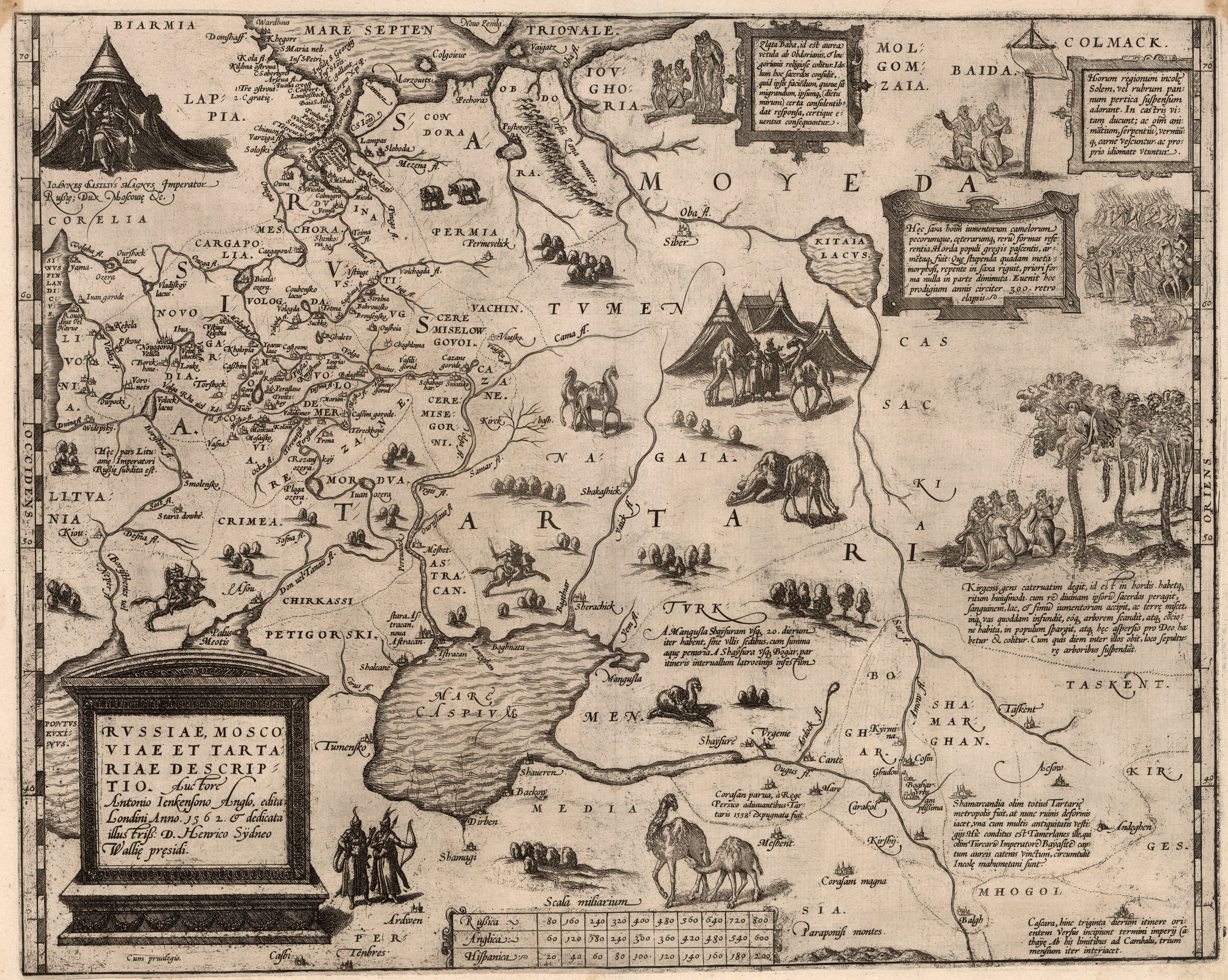 IMAGE 1: Russia in the Sixteenth Century. ‘Russiae, Moscoviae Et Tartariae Descriptio. Auctore Antonio Ienkensono Anglo, edita Londini Anno 1562 & dedicata illustriss. D. Henrico Sijdneo Walliei presidi. Cum privilegio’, in Abraham Ortelius (1527-1598), Theatrum Orbis Terrarum (Antwerp: Gielis Coppens van Diest, 1570), page 46. Engraver: Frans Hogenberg. Dimensions: Object Height: 36 cm; Object Width: 45 cm. Scale: 1 : 12,000,000. List Number: 10000.101. Pub List Number: 10000.000. Image Number: 10000101.jp2. David Rumsey Historical Map Collection. © 2000 by Cartography Associates. Attribution-NonCommercial-ShareAlike 3.0 Unported (CC BY-NC-SA 3.0).