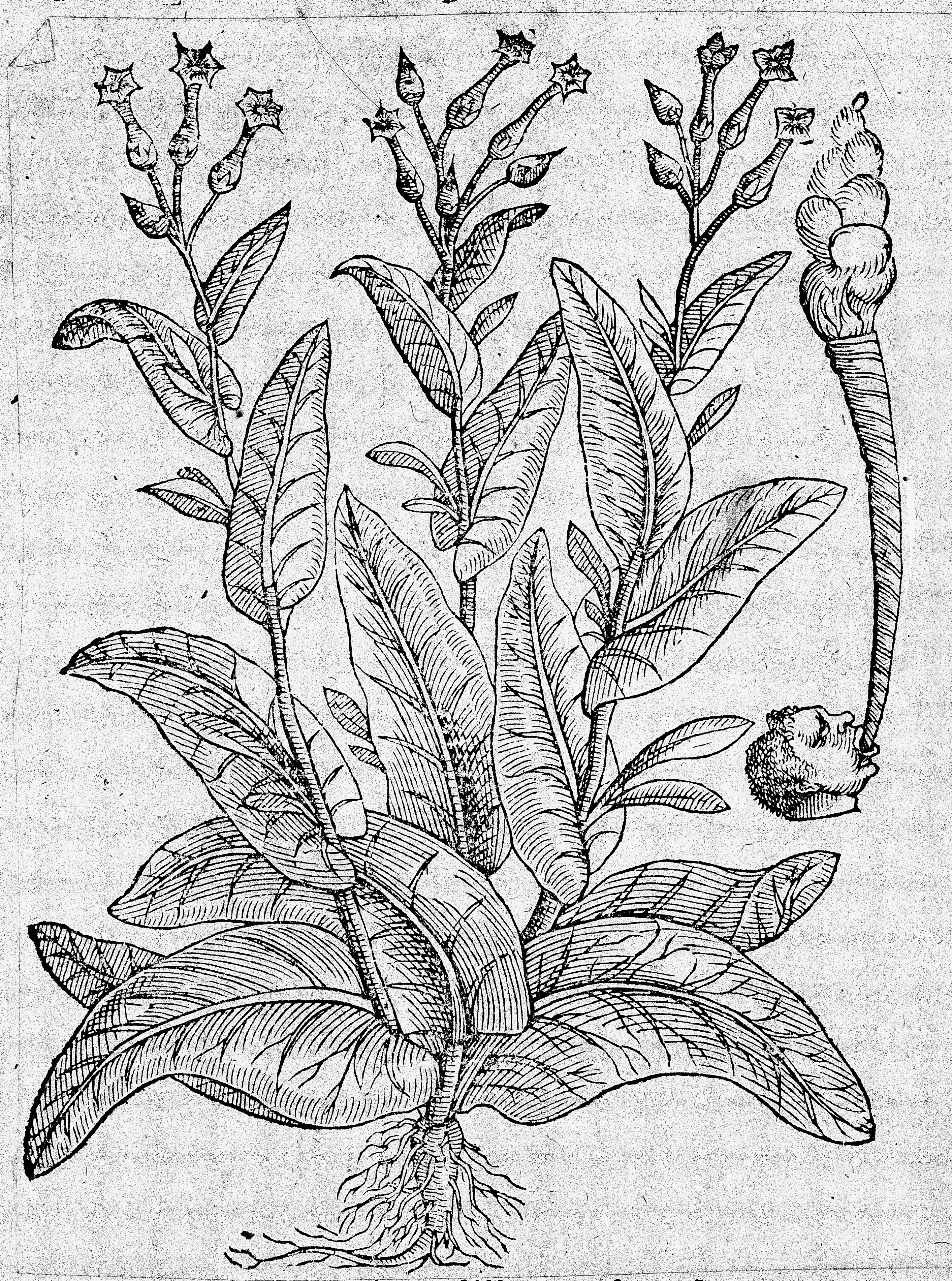 IMAGE 19: A tobacco plant, with a smoker of tobacco on the side, in Matthias de L’Obel and Pierre Pena, Stirpium adversaria nova, perfacilis vestigatio luculentaque accessio ad priscorum, praesertim Dioscoridis, et recentiorum materiam medicam. Quibus propediem accedet altera pars (London: T. Purfoot, 1570[71]). Wellcome Library, Record no. 28169657. Photo Number: M0011077. Wellcome Collection, downloaded from Wikimedia Commons. Creative Commons Attribution 4.0 International (CC BY 4.0).