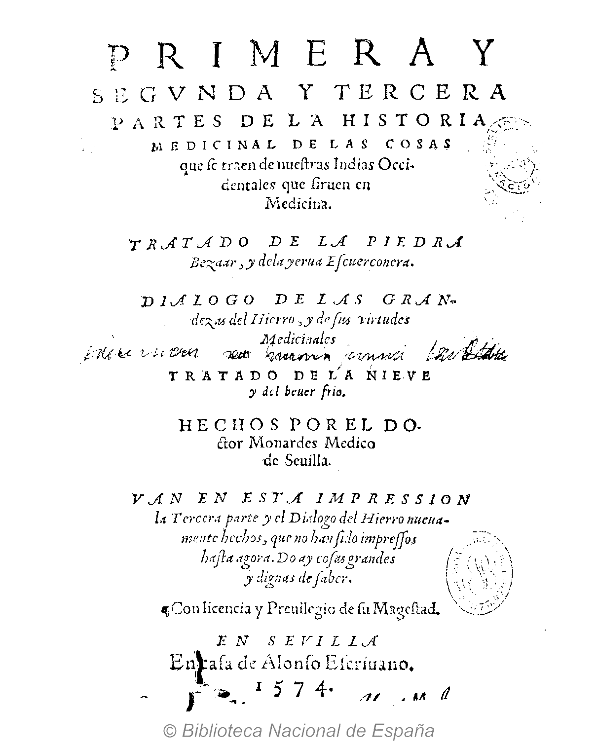 IMAGE 20: Introducing sassafras to a Spanish-reading audience. Title Page, Nicolás Monardes, Primera y segunda y tercera partes de la historia medicinal de las cosas que se traen de nuestras Indias Occidentales que siruen en medicina (Seville: Alonso Escriuano, 1574). Signatura: R/9108, U/5426. Biblioteca Digital Hispánica, Biblioteca Nacional de España.