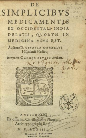 IMAGE 21: Translating sassafras for a Latin-reading audience. Title Page, Nicolás Monardes, De simplicibvs medicamentis ex occidentali India delatis quorum in medicina vsvs est (Antwerp: Ex officina Christophori Plantini, 1574), translated by Carolus Clusius. Missouri Botanical Garden, Peter H. Raven Library, downloaded from Biodiversity Heritage Library. Public Domain.