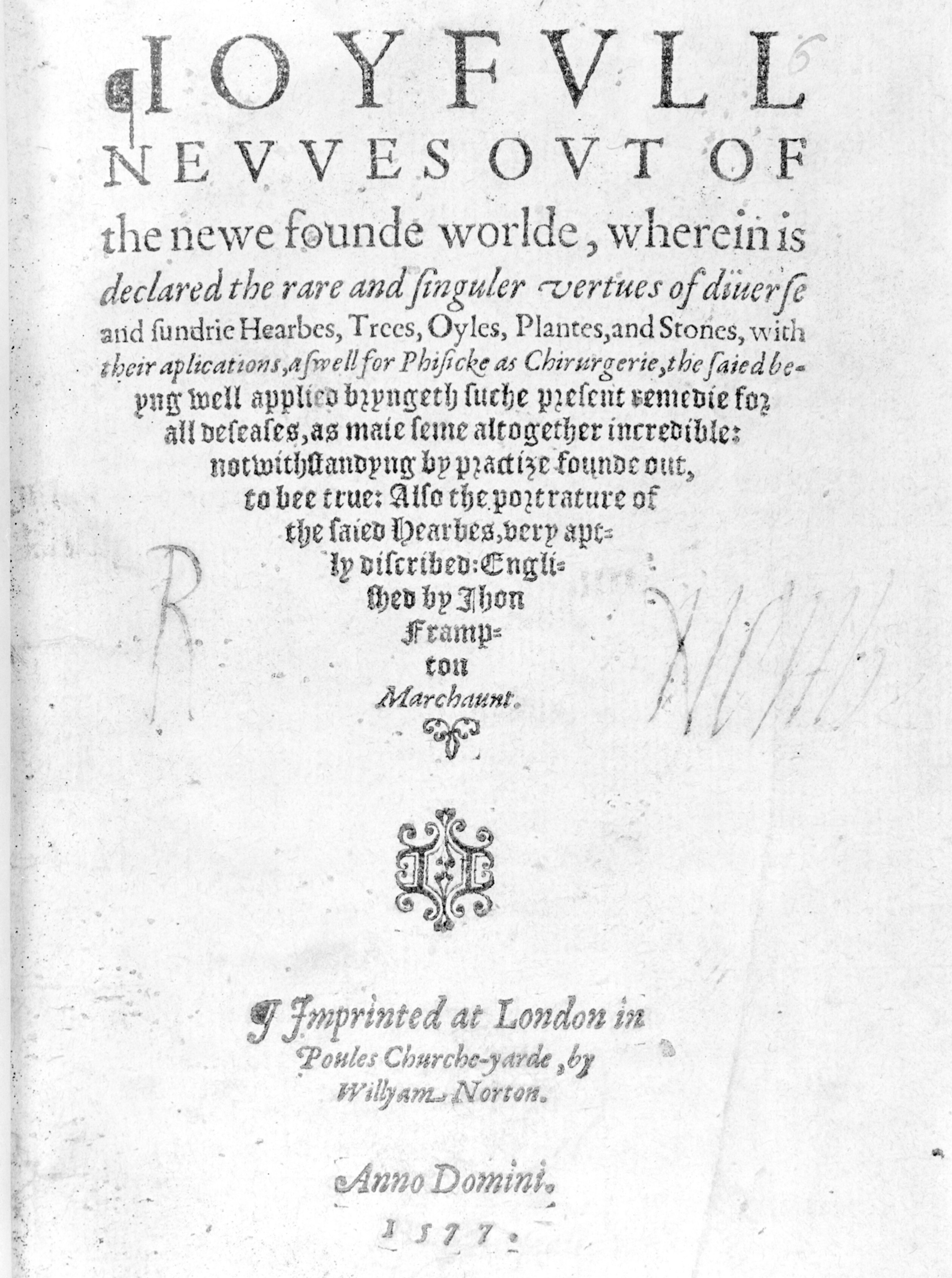 IMAGE 23: Translating sassafras for an English-reading audience. Title Page, Nicolás Monardes, Ioyful nevves ovt of the newe founde worlde, wherein is declared the rare and singuler vertues of diuerse and sundrie Hearbes, Trees, Oyles, Plantes, and Stones (London: Poules Churche-yearde, by Willyam Norton, 1577), translated by Jhon Frampton. Beinecke Digital Collections, Beinecke Rare Book & Manuscript Library, Yale University.