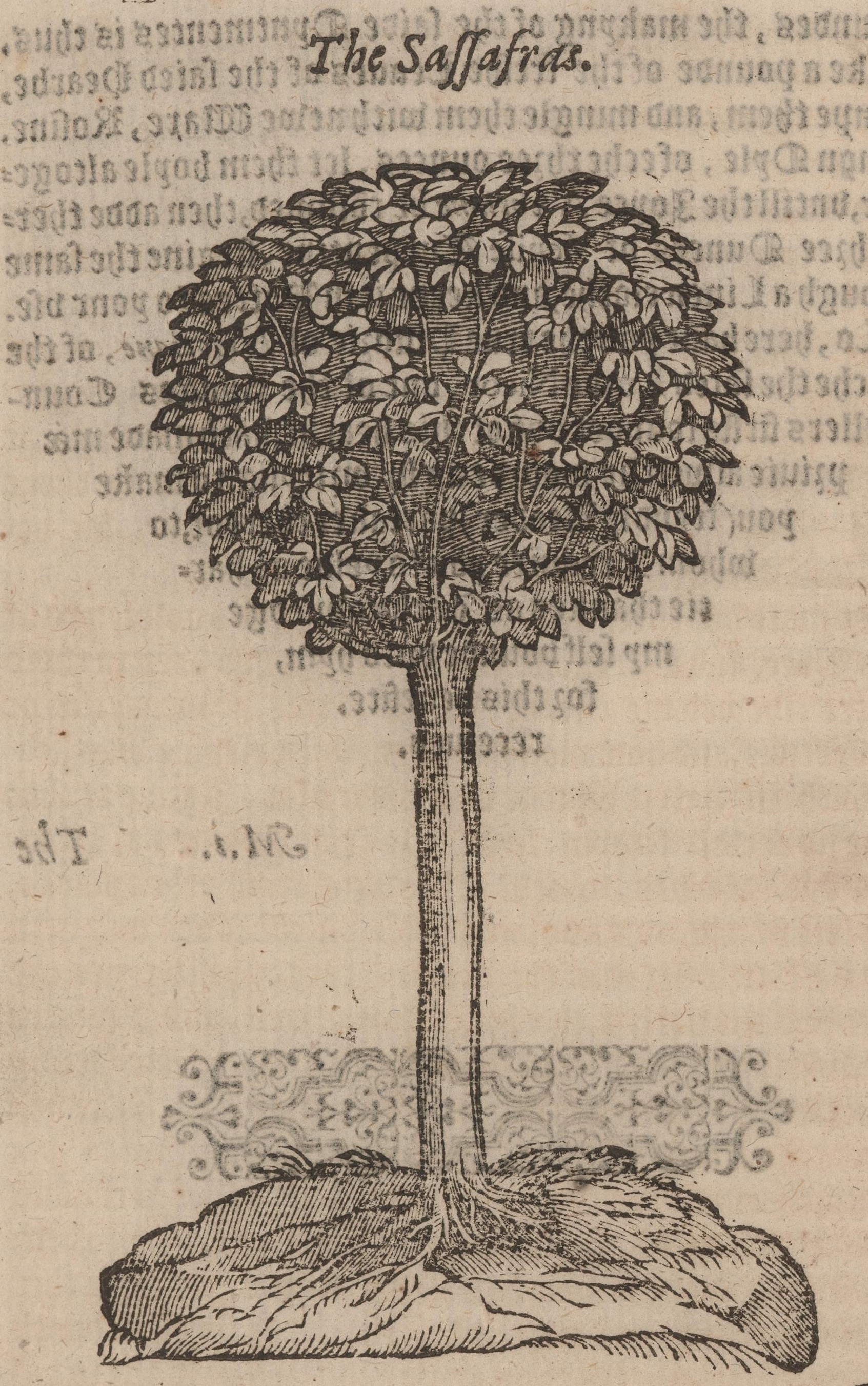 IMAGE 24: Making sassafras visible. ‘The Sassafras’, in Nicolás Monardes, Ioyful nevves ovt of the newe founde worlde, wherein is declared the rare and singuler vertues of diuerse and sundrie Hearbes, Trees, Oyles, Plantes, and Stones (London: Poules Churche-yearde, by Willyam Norton, 1577), translated by Jhon Frampton, folio 45v. Description: “Monardes was the first to write of sassafras and advocate its use. During the sixteenth century, sassafras was one of the foremost of New World exports and was used in the treatment of syphilis, as well as to cure fevers, including those from malaria. Scientific name: Sassafras officinale.” Technique: Woodcut. Image Height: 11.1 cm. Image Width: 6.7 cm. Page Height: 17.5 cm. Page Width: 13 cm. Materials medium: ink. Materials support: paper. Accession number: 01798. Record number: 01798-1. JCB call number: B577 M735j. Provenance/Donor: Acquired in 1854. ©John Carter Brown Library, Box 1894, Brown University, Providence, R.I. 02912.