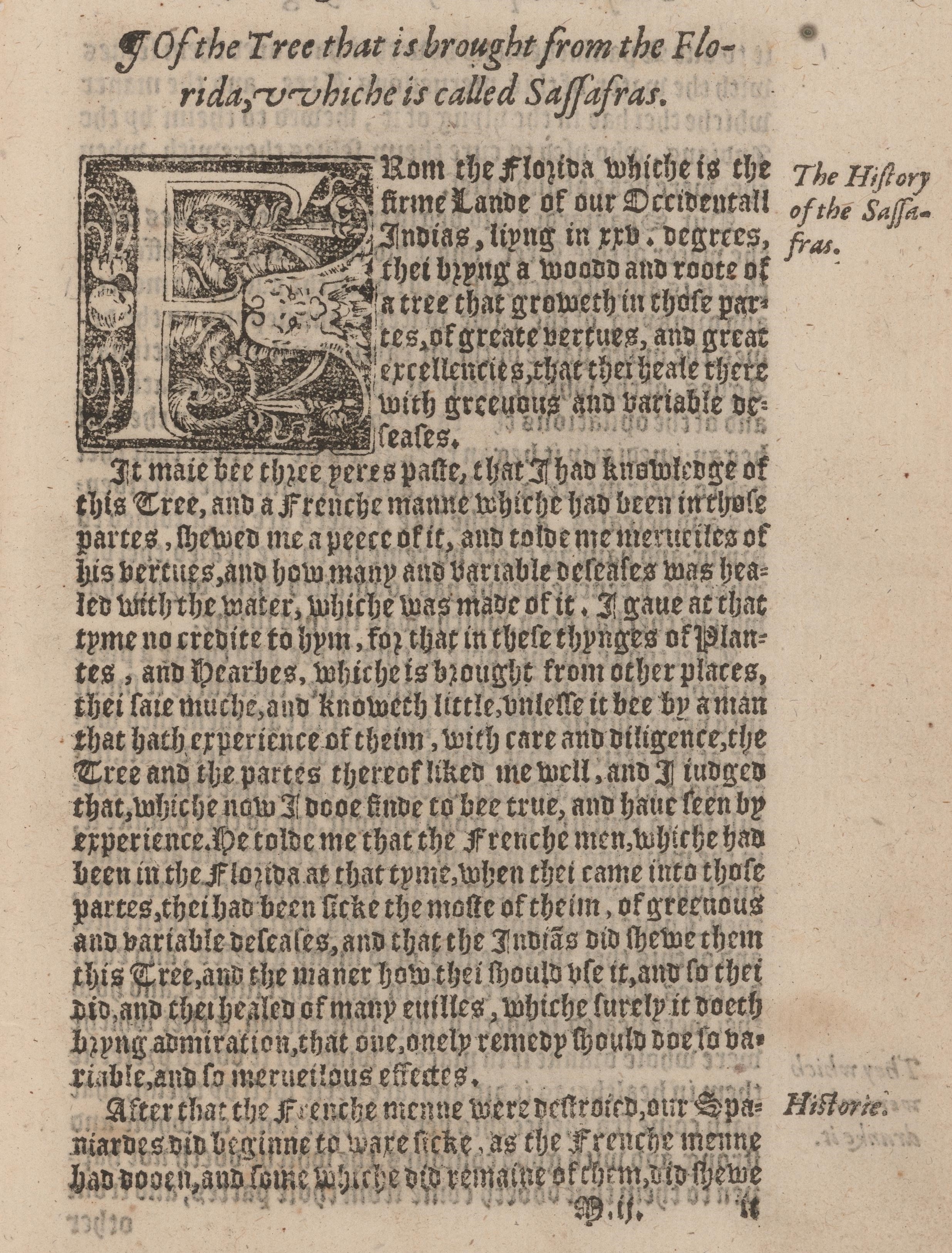 IMAGE 25: The beginning of Monardes’ textual description of Sassafras, in Nicolás Monardes, Ioyful nevves ovt of the newe founde worlde (London, 1577), translated by Jhon Frampton, folio 46r. ©John Carter Brown Library, Box 1894, Brown University, Providence, R.I. 02912.