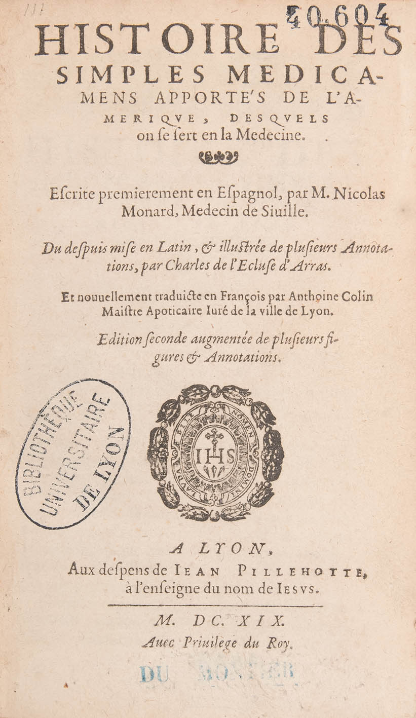 IMAGE 26: Translating sassafras for a French-reading audience. Title page, Nicolás Monardes, Histoire des simples medicamens apportés de l’Ameriqve, in Histoire des drogues, espiceries, et de certains medicamens simples, qui naissent és Indes & en l’Amérique, divisé en deux parties. La première comprise en quatre livres: les deux premiers de M. Garcie du Jardin, le troisiesme de M Christophle de la Coste, & le quatriesme de l’Histoire du Baulme adjoustée de nouveau en ceste seconde edition: où il est prouvé, que nous avons le vray Baulme d’Arabie, contre l’opinion des anciens & modernes. La seconde composée de deux livres de maistre Nicolas Monard, traictant de ce qui nous est apporté de l’Amérique Le tout fidellement translaté en François, par Antoine Colin, maître apothicaire juré de la ville de Lyon, par luy augmenté de beaucoup d’annotations, de diverses drogues estrangeres, & illustrée de plusieurs figures, non encore veuës (Lyon: Jean Pillehotte rue Mercière, 1619), 2nd edition [first edition, 1602]. BU Lyon 1, Université Lyon 1, France.