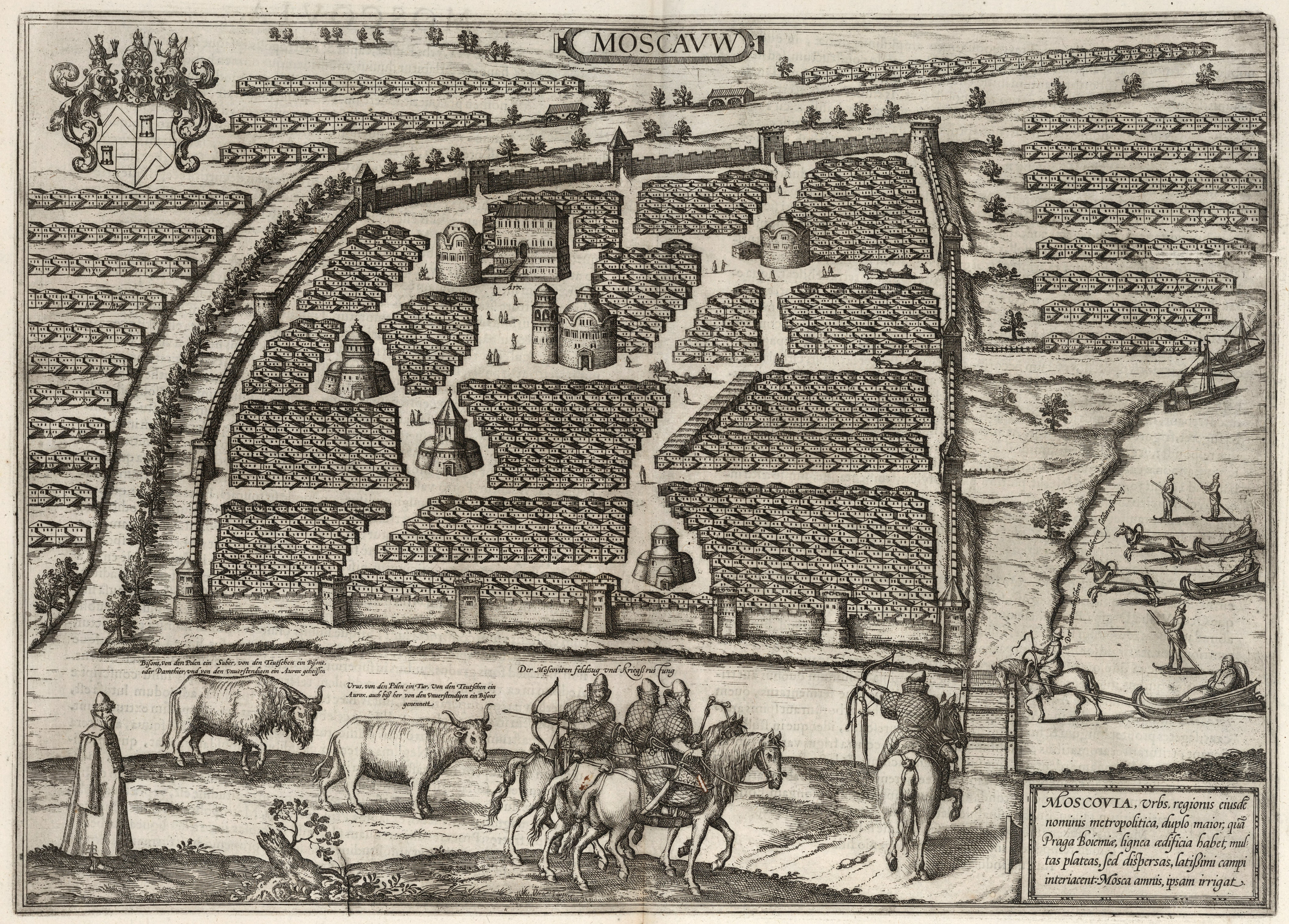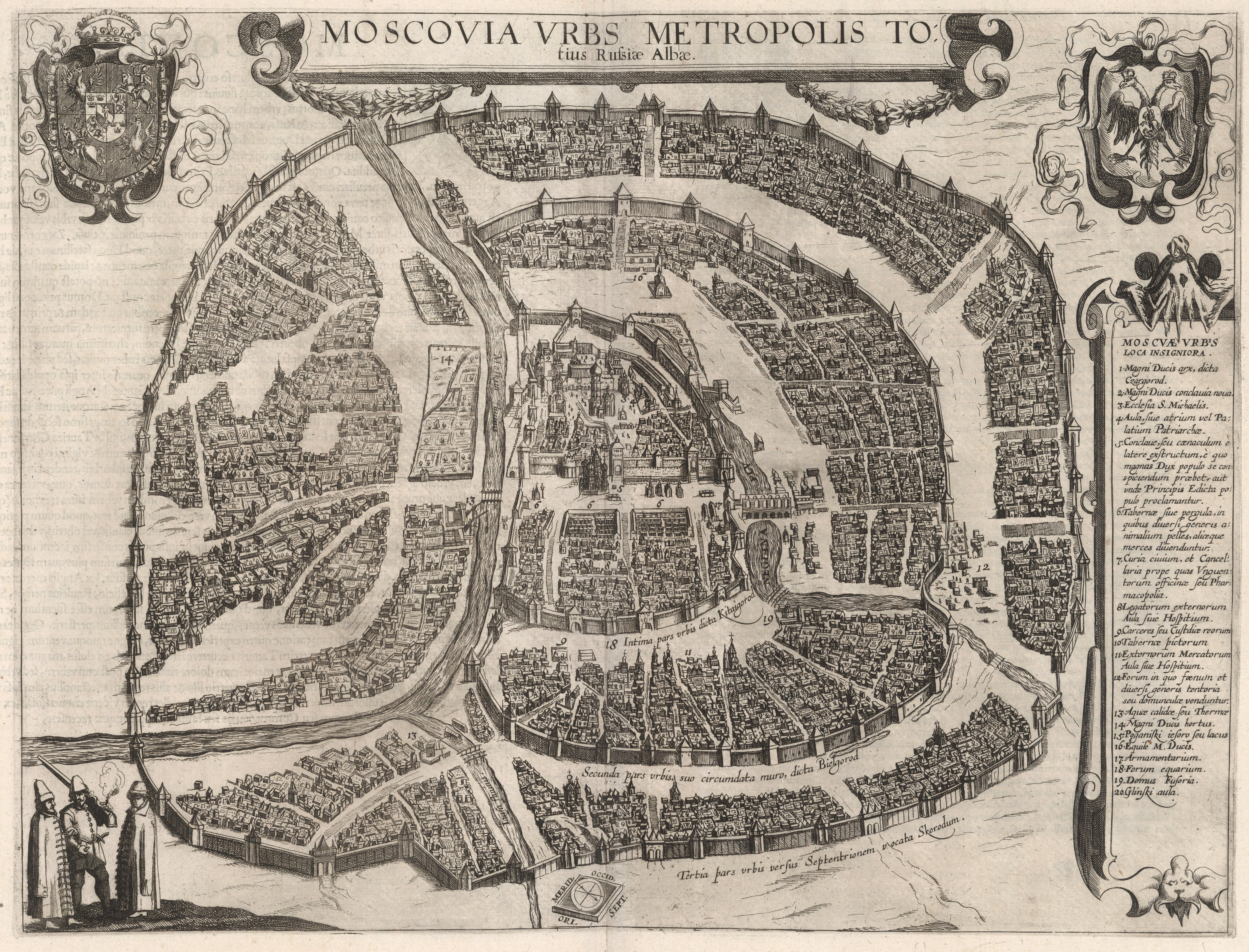 IMAGE 2: View of Moscauw [Moscow] (1575), in Franz Hogenberg and Georg Braun, Civitates Orbis Terrarum, van der Krogt’s XVIII edition (Cologne: Peter von Brachel, 1640), Vol. II, page 47. Description: “The Civitates Orbis Terrarum was the first atlas of world cities and one of the most important books published in the late 16th century. Although led by Braun and Hogenberg, the books were created by a large team of writers, engravers, and artists.” Dimensions: Object Height: 35 cm; Object Width: 50 cm. List Number: 12126.219. Pub List Number: 12126.000. Image Number: 12126219.jp2. David Rumsey Historical Map Collection. © 2000 by Cartography Associates. Attribution-NonCommercial-ShareAlike 3.0 Unported (CC BY-NC-SA 3.0).