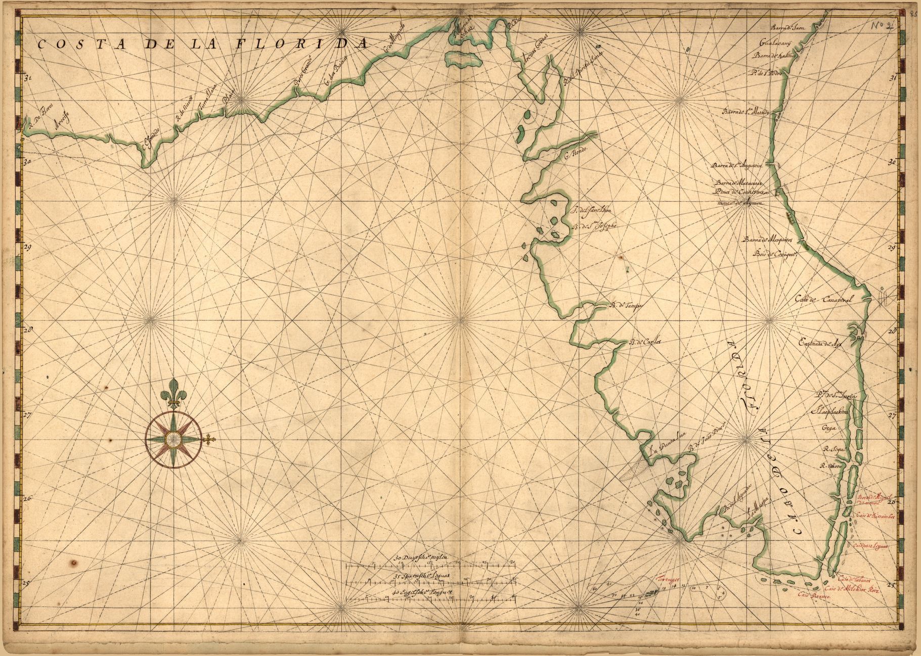 IMAGE 27: Spanish Florida, an important source of sassafras. ‘Map of the Peninsula of Florida’ (1639?). Attributed to Joan Vinckeboons. Description: “Depths shown by soundings. Shows the Peninsula of Florida and adjacent islands from Rio de las Flores and includes coastline, coastal features, and pictorial representation of palm trees along the Atlantic Coast near St. Augustine with most of geographic names in Spanish. Pen-and-ink and watercolor. Attributed to Joan Vinckeboons by comparison with his other Dutch maps in Henry Harrisse collection.” Medium: 1 ms. map : col., paper backing ; 50 x 71 cm. Call Number/Physical Location: G3291.S12 coll .H3. Library of Congress Control Number: 2003629547. Library of Congress Geography and Map Division, Washington, D.C.
