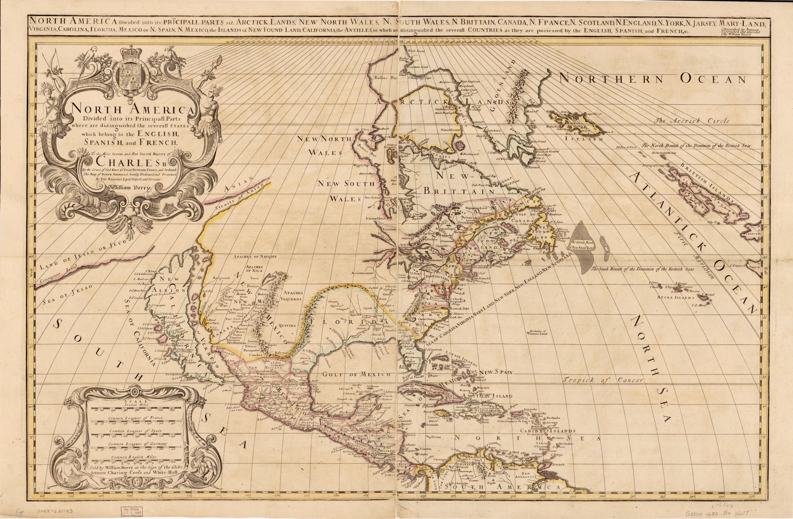 IMAGE 28: Entangled empires. ‘North America divided into its pricipall parts, viz. Arctick lands, New North Wales, N. South Wales, N. Brittain, Canada, N. France, N. Scotland, N. England, N. York, N. Jarsey, Mary-Land, Virginia, Carolina, Florida, Mexico, the islands of New Found Land, California, the Antilles, in which are distinguished the severall countries as they are possessed by the English, Spanish, and French, &c.’ (London: Sold by William Berry at the sign of the globe between Charing Cross and White-Hall, 1680). Description: “Relief shown pictorially. At upper right: Described by Sanson, corrected and amended by William Berry. Prime meridian: Ferro. Includes ill. Sectioned and mounted on cloth backing.” Medium: 1 map : hand col. ; 53 x 86 cm. Call Number/Physical Location: G3300 1680 .B4. Library of Congress Control Number: 2002621143. Library of Congress Geography and Map Division, Washington, D.C.