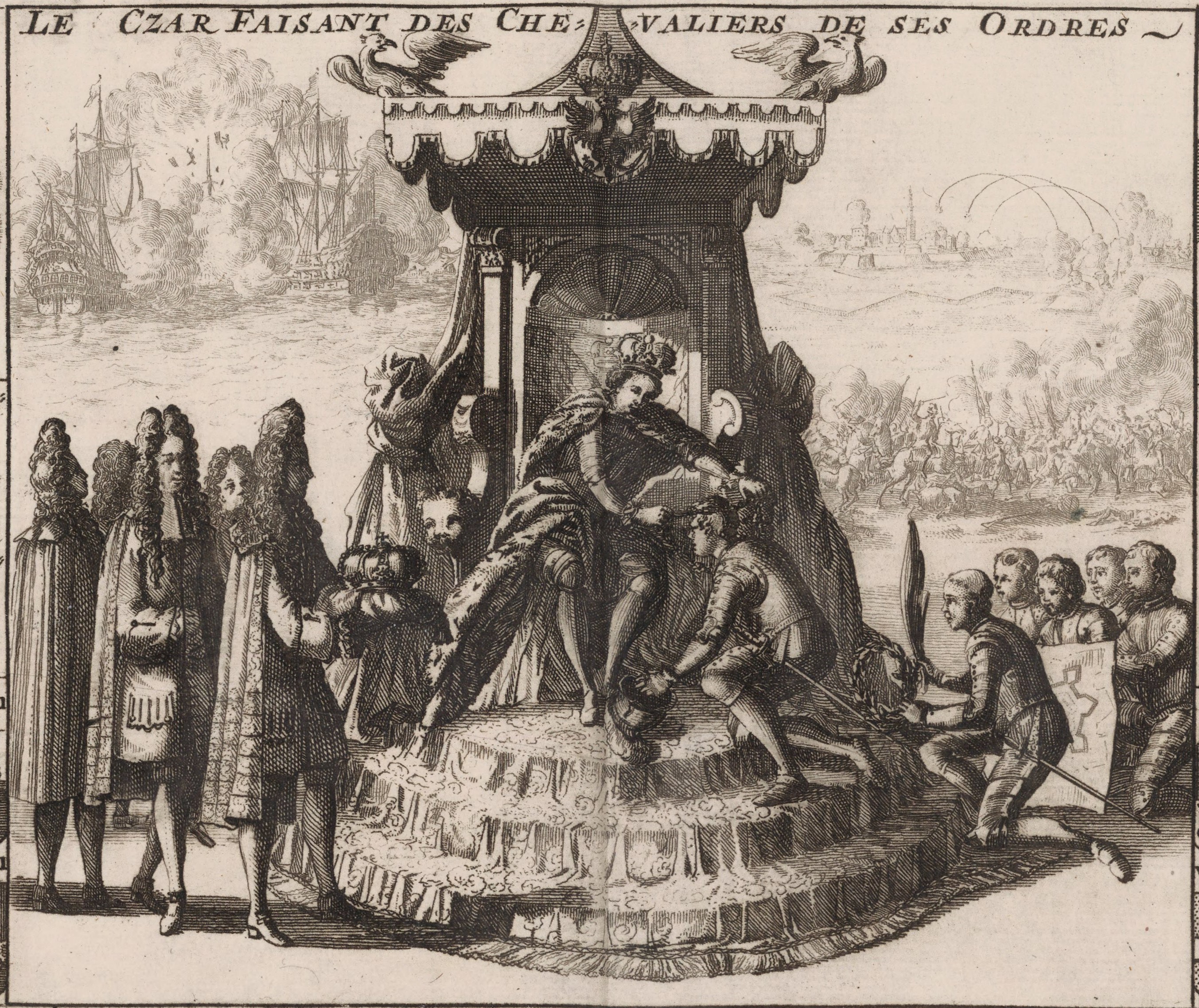IMAGE 29: The Tsar, surrounded by nobles. ‘Le Czar faisant des chevaliers le ses ordres’, engraved view from ‘Carte des ordres de chevalerie de Sa Majeste Czarienne, ses titres, l’etat de sa noblesse, profil de son palais et la vue de Moscow’, Tome 4, No. 34 [to accompany] Atlas Historique, Ou Nouvelle Introduction A l’Histoire, aÌ la Chronologie & aÌ la Geìographie Ancienne & Moderne : Repreìsenteìe dans de Nouvelles Cartes, OuÌ l’on remarque l’Etablissement des Etats & Empires du Monde, leur dureìe, leur chute, & leurs differens Gouvernemens … Par Mr. C.***. Avec des Dissertations sur l’Histoire de chaque Etat. Par Mr. Gueudeville. Amsterdam, chez l’Honore & Chatelain. Tome 1-7 (Amsterdam: chez les Freres Chatelain Libraires, 1714). Description: “First edition of this Historical atlas of the world, with new introduction to history and chronology and updated maps, in 7 volumes, dated 1714-1720. By Henri Abraham Chatelain and descriptive text for volumes I-VI, by Nicolas Gueudeville. … Volumes are bound in brown leather covers with gold-embossed on spine and title “Atlas Historique Tom …” stamped in gold. … The maps were accompanied by information pertaining to cosmography, geography, history, chronology, genealogy, topography, heraldry, and costumes of the world. … An ambitious and beautifully-presented work, the Atlas Historique was intended for the general public, fascinated in the early eighteenth century by the recently conquered colonies and the new discoveries. Distant countries, such as the Americas, Africa, the Middle East, Mongolia, China, Japan, Indonesia, etc., take an important place in this work. … Other sections deal with the history of the [E]uropean countries, and covers a wide range of subjects including genealogy, history, cosmography, topography, heraldry and chronology, costume of the world, all illustrated with numerous engraved maps, plates of local inhabitants and heraldic charts of the lineages of the ruling families of the time. … (From Paulus Swaen catalog)”. Dimensions: Object Height: 45 cm; Object Width: 53 cm. List Number: 13272.412. Pub List Number: 13272.000. Image Number: 13272412.jp2. David Rumsey Historical Map Collection. © 2000 by Cartography Associates. Attribution-NonCommercial-ShareAlike 3.0 Unported (CC BY-NC-SA 3.0).