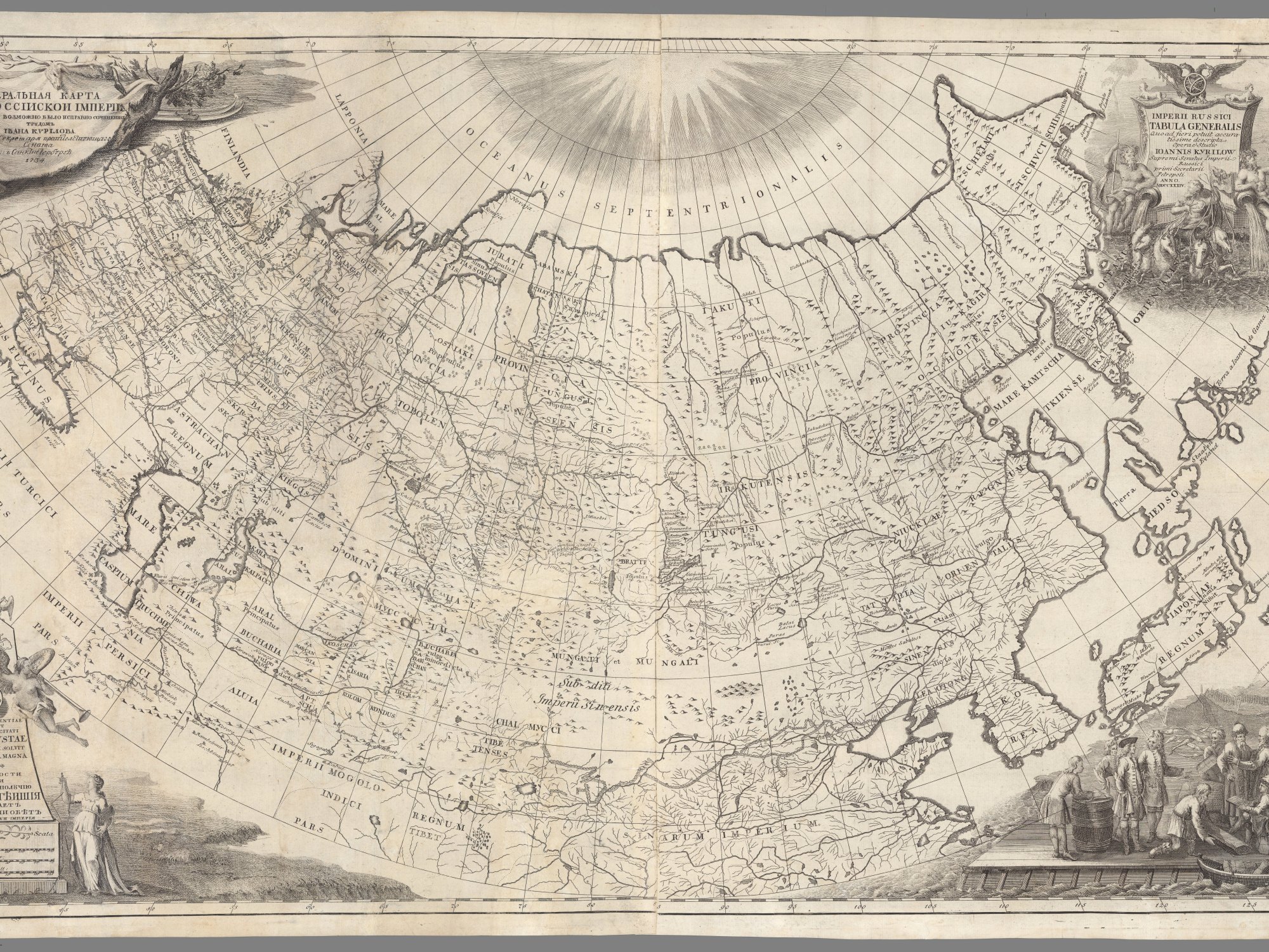 IMAGE 33: Russian Imperial Expansion made visible. ‘Imperii Russici Tabula Generalis’, 1734. Creator: Ivan Kirilov (1689-1737). Description: “Map of Russian Empire. Russian title is in upper left and Latin title is in upper right. Shows provinces, major cities, towns, rivers and lakes. Relief shown pictorially. Includes decorative cartouches decorated with landscape and allegorical figures. Kirilov’s map was the first map published in Russia to show the entire country.” Dimensions: Object Height: 57 cm; Object Width: 91 cm. Scale: 1: 12,000,000. Pub List Number: 13253.000. Image Number: 13253000.jp2. David Rumsey Historical Map Collection. © 2000 by Cartography Associates. Attribution-NonCommercial-ShareAlike 3.0 Unported (CC BY-NC-SA 3.0).