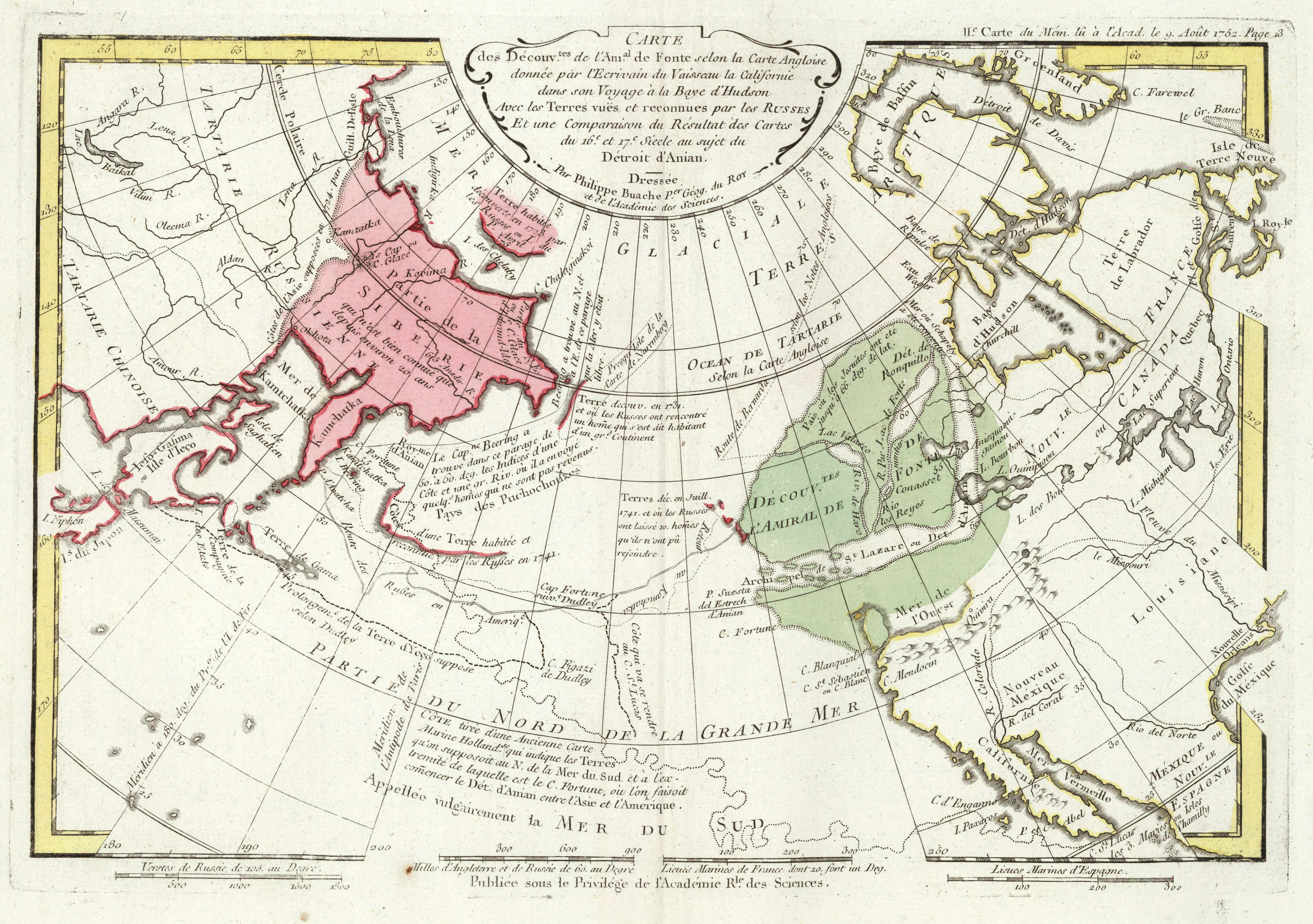 IMAGE 36: Exploring the New World from the West. ‘Carte des Decouv.tes de l’Am.al de Fonte selon la Carte Angloise donnée par l’Ecrivain du Vaisseu la Californie dans son Voyage à la Bay d’Hudson Avec les Terres vuës et reconnues pars les Russes…’ (c. 1752) in Phillipe Bauche, Considerations Geographiques Et Physiques Sur Les Nouvelles Decouvertes Au Nord de La Grande Mer Appellee Vulgairement La Mer Du Sud; avec des cartes, qui y sont relatives … (Paris: Academie Royale des Sciences, 1753). Description: “Color map of the North Pacific and contiguous parts of the Northwest Coast of America and Northeast Coast of Asia. Includes exploration by the Russians up to 1750, and by de Fonte. Shows Bay of the West and the channel for a water course via the Archipel de St. Lazare ou Strait of Anian toward Hudson’s Bay. Above neat line at right: IIe. Carte du Mem. lu a l’Acad. le 9 Aout 1752. Page 13. Includes historical tracks of various voyages”. Dimensions: Object Height: 22 cm; Object Width: 31 cm. Scale: 1 : 30,096,000. List Number: 11780.004. Pub List Number: 11780.000. Image Number: 11780004.jp2. David Rumsey Historical Map Collection. © 2000 by Cartography Associates. Attribution-NonCommercial-ShareAlike 3.0 Unported (CC BY-NC-SA 3.0).