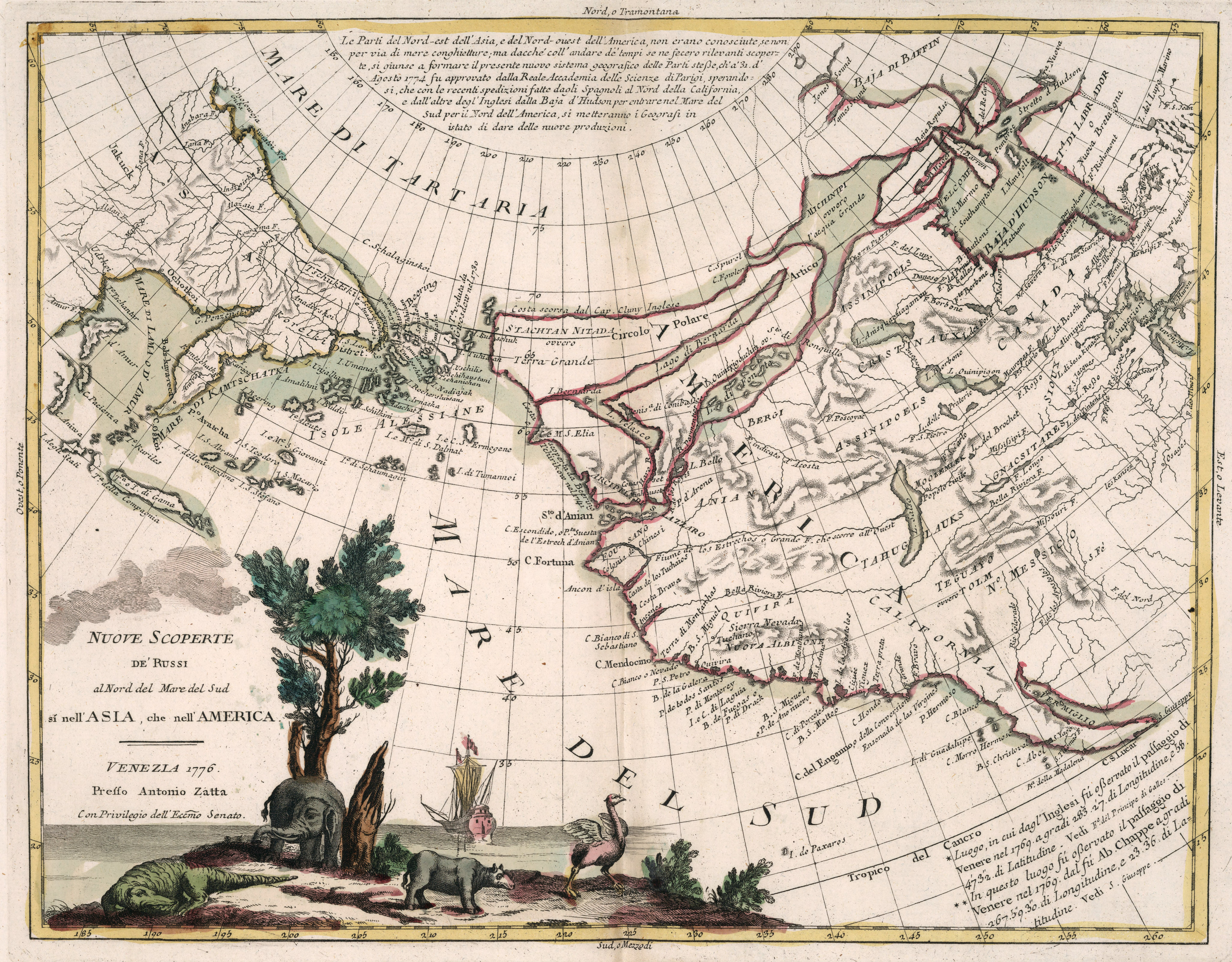 IMAGE 37: Russian Expansion into Alaska. ‘Nuove Scoperte de’ Russi al nord del Mare del Sud si nell’ Asia’ (1776), in Atlante novissimo, illustrato ed accresciuto sulle osservazioni, e scoperte fatte dai piu celebri e piu recenti geografi (Venice: Antonio Zatta, 1779-1784, 4 tomes), Tome III, page 42. Description: “Engraved hand-colored in outline, double-page map of the northwest coast of North America and northeast Asia including the North Pacific Ocean to the Bering Strait and the Kamchatka Peninsula. Alaska shown by a group of islands off the coast of Russia, identified as Isole Alessiane. There is a notation of the Chinese colony of Fou-Sang in the vicinity of Vancouver Island. Map shows political divisions, cities, towns, coastal towns, mountains and rivers…Bound in half leather marbled covered boards with “Atlante novissi. Venez, 1788 P.A. Zat.” stamped in gold on spine.” Dimensions: Object Height: 31 cm; Object Width: 39 cm. Scale: 1 : 25,000,000. List Number: 11598.240. Pub List Number: 11598.000. Image Number: 11598240.jp2. David Rumsey Historical Map Collection. © 2000 by Cartography Associates. Attribution-NonCommercial-ShareAlike 3.0 Unported (CC BY-NC-SA 3.0).