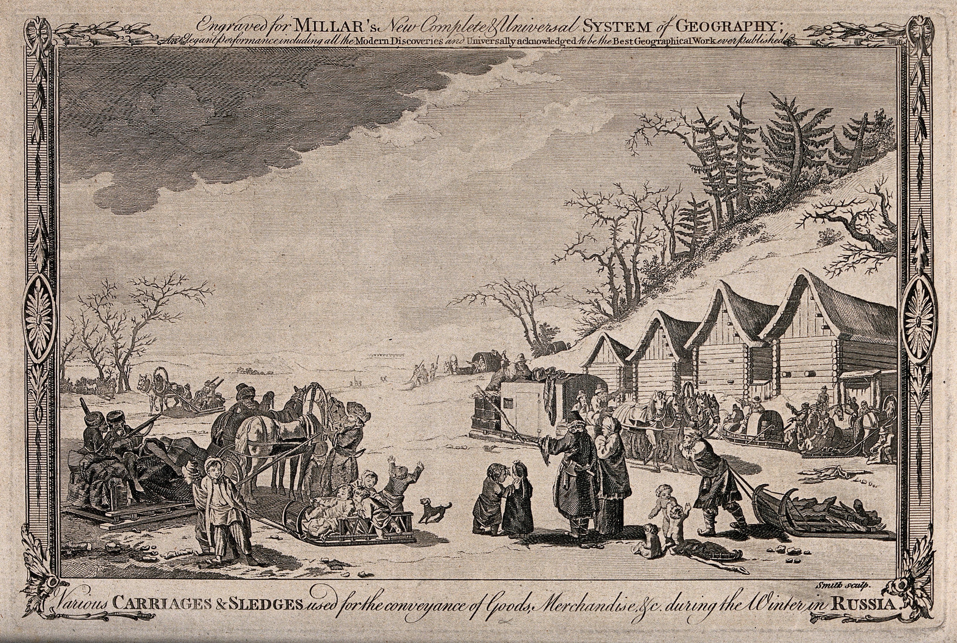 IMAGE 43: Overland transportation . ‘Russia: people carrying goods on sledges over the snow’ (London: Alexander Hogg, 1785). Lettering: “Various carriages & sledges used for the conveyance of goods, merchandise, &c. during the winter in Russia. [ ] Engraved for Millar’s New Complete Universal System of Geography; an elegant performance including all the modern discoveries and universally acknowledged to be the best geographical work ever published. Smith sculp [engraving by Smith].” Physical Description: 1 print : engraving ; image 16.4 x 25.8 cm. Reference: Wellcome Library no. 37027i. Wellcome Collection. Creative Commons Attribution 4.0 International (CC BY 4.0).