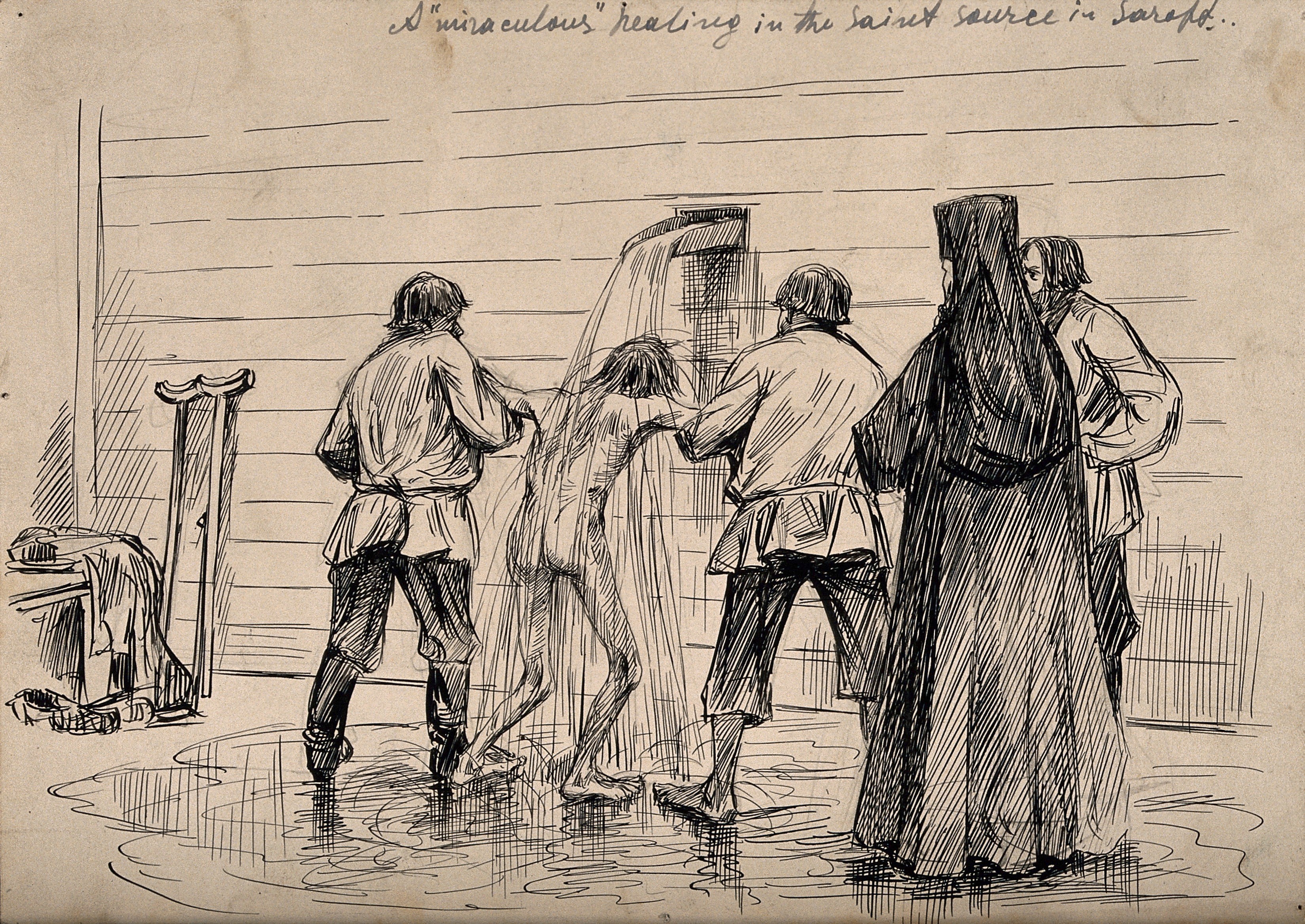 IMAGE 44: Continuing traditions of healing. ‘A lame man being doused in water from a holy spring to procure a miraculous cure’ (1903). Description: “Possibly a scene in Sarepta, which is apparently the name of the German colony at Krasnoarmeisk (Krasnoarmeysk) on the west bank of the Volga near Volgograd (Tsaritsyn, Stalingrad), which has natural mineral waters”. Lettering: “A “miraculous” healing in the Saint Source in Sarapa.” Physical Description: 1 drawing : pen and ink. Reference: Wellcome Library no. 22761i. Wellcome Collection. Creative Commons Attribution 4.0 International (CC BY 4.0).
