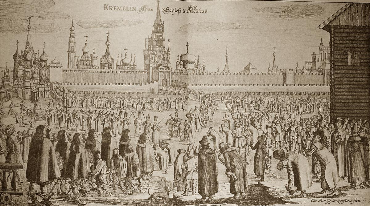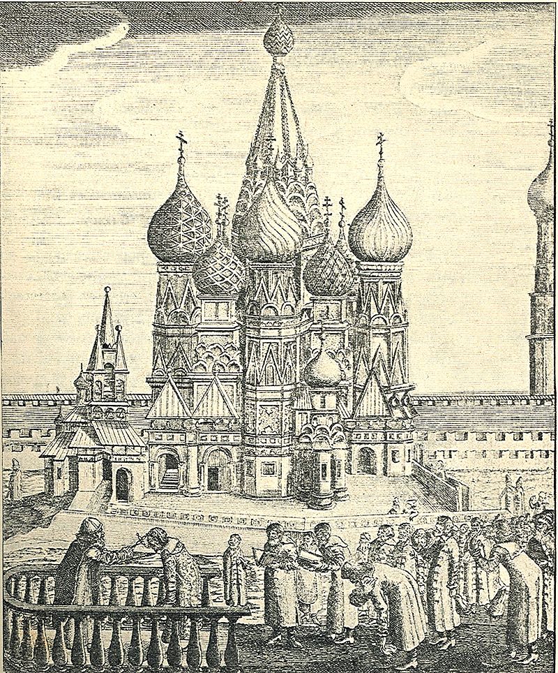 IMAGE 6: Adam Olearius, ‘The Grand Duke leaves for a pilgrimage’, with a view of Trinity Church (St. Basil’s Cathedral), in Adam Olearius, Opisanie puteshestviia v Moskoviiu (1906 [mid-seventeenth century]). BUK VO Regional Universal Scientific Library, Russia, downloaded from Wikimedia Commons.