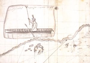 IMAGE 35: The Great Northern Expedition. Sven Larsson Waxell, ‘Bering’s first encounter with Aleuts at Shumagin Island. Drawing by Sven Waxell, the mate of Bering’s ship St. Peter’, circa 1741.