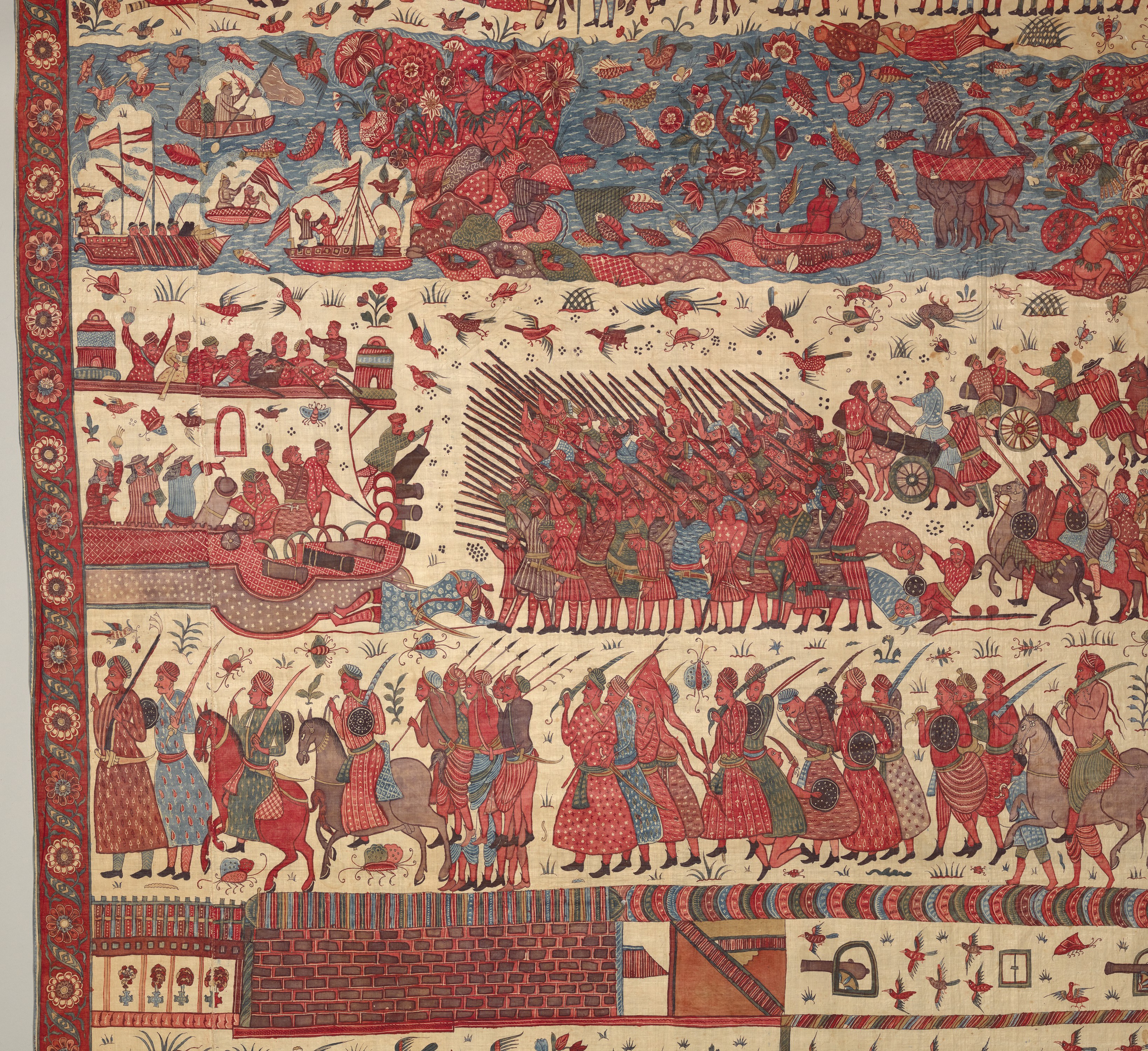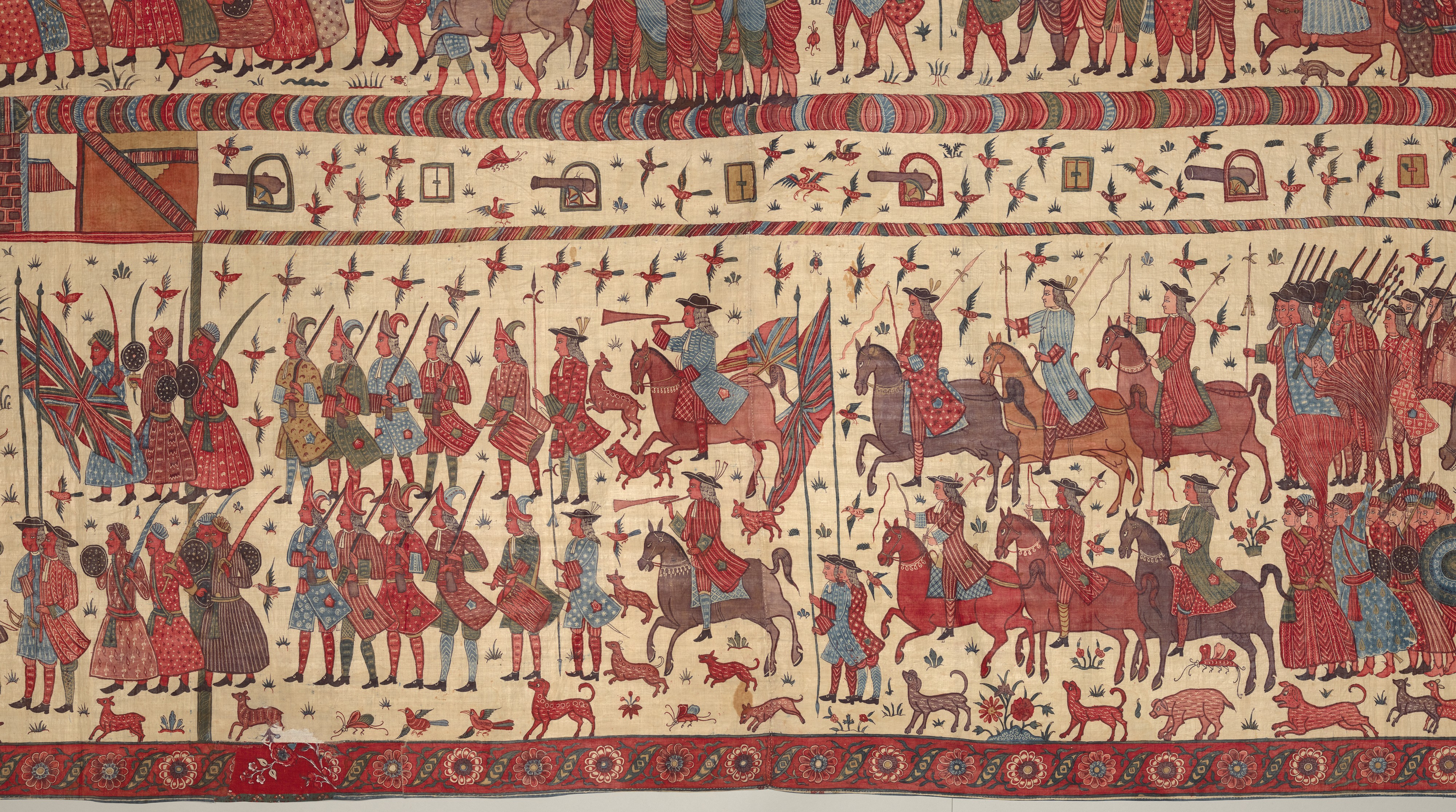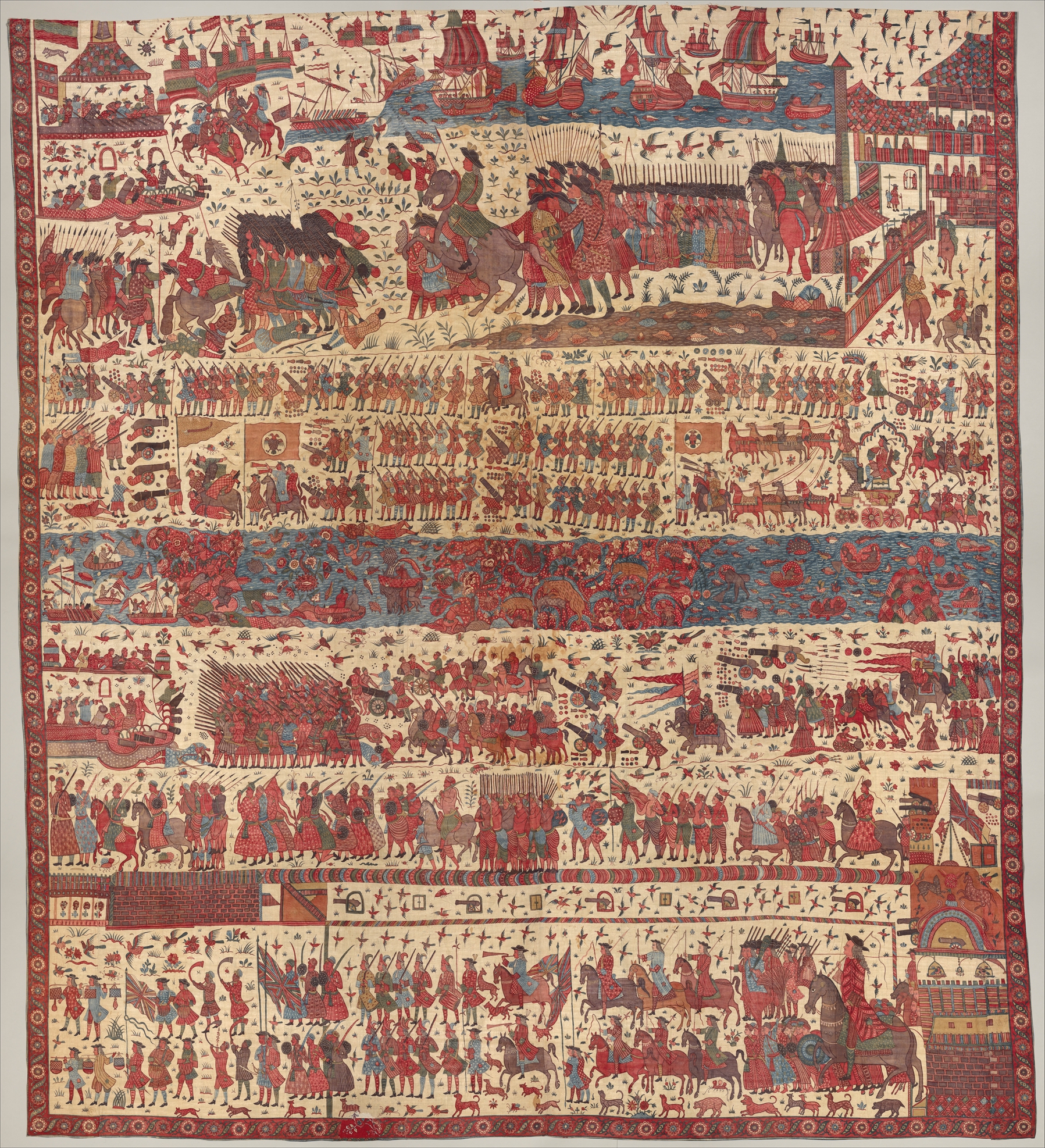 IMAGE 14-26: A South Asian visual depiction of East India Company alliances with South Asian states and rulers. ‘Hanging [Cloth] depicting a European conflict in South India’, before 1763. Description: “This multilayered tableau of a battle is the most spectacular, complex, and complete surviving example of a rare chintz history painting. The hanging may celebrate the successful 1760–61 English siege of Pondicherry, on the southeast coast of India, headquarters of the French East India Company. The English forces (under a stylized Union Jack) are shown fighting alongside allied local soldiers. Indian regiments appear to be distinguished by dress—Muslims with long gowns and bushy beards, the Hindus in skirt cloths—indicative of the complex web of regional alliances forged by the European trading companies. Two ships (upper register, center) flying a simplified version of the triple fleur-de-lis and crown, the insignia of the French East India Company flag from 1756, represent the defeated French.” Culture: Indian, Coromandel Coast, for British market. Medium: Cotton, plain weave (drawn and painted, mordant and resist dyed). Dimensions: Overall: 116 3/4 × 103 in. (296.5 × 261.6 cm). Credit Line: Purchase, Harris Brisbane Dick Fund and Louis V. Bell Fund; Larry and Ann Burns and Brett and Sara Burns Gifts, in honor of Austin B. Chinn; and Austin B. Chinn and Joseph Conforti and Douglas Jakubowski Gifts, 2014. Accession Number: 2014.88. The Metropolitan Museum of Art, New York. Public Domain.