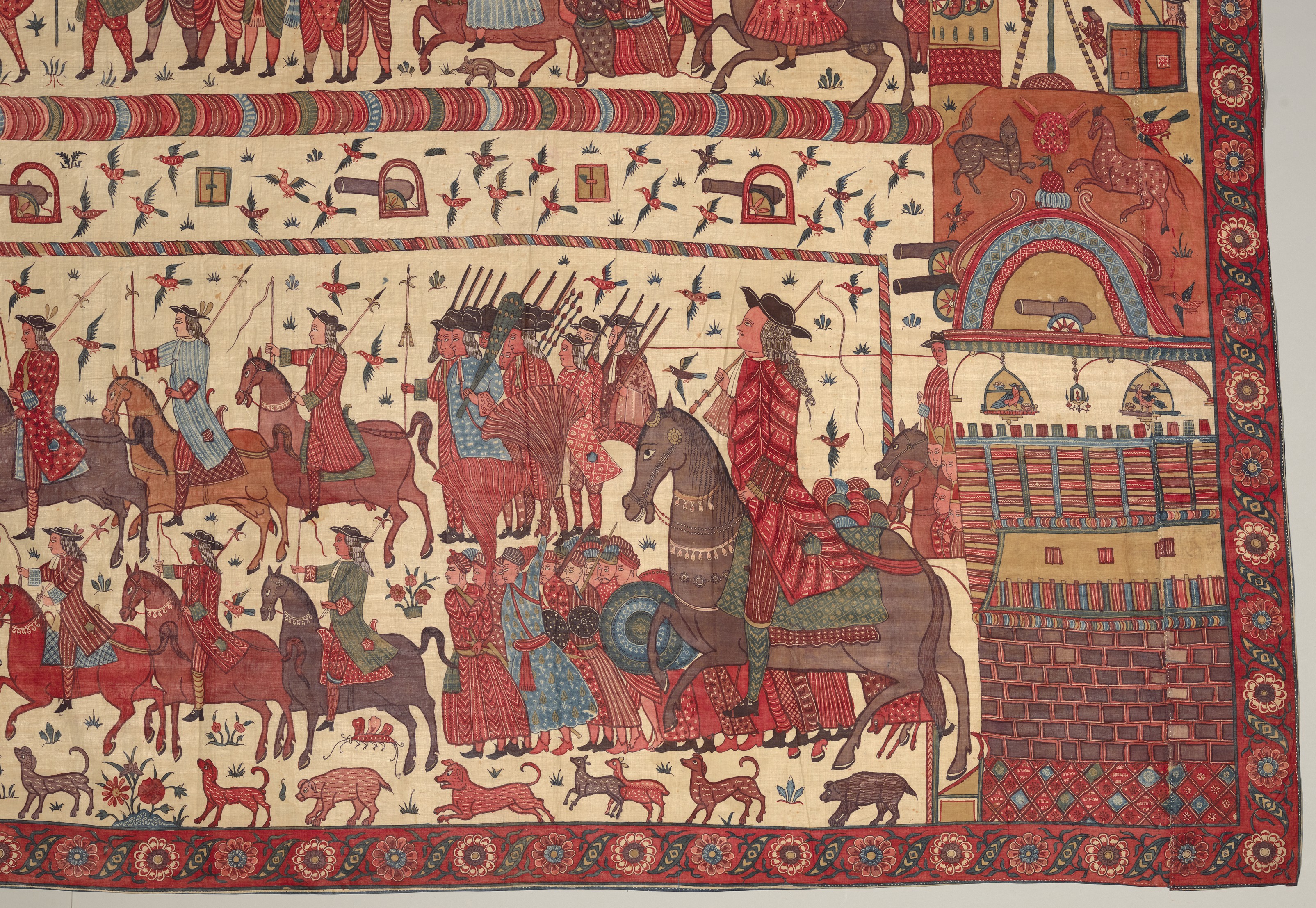 IMAGE 11-13: Textiles, Cultural Encounter, and the Dutch East India Company in South Asia. ‘Petticoat panel’, third quarter of the 18th century. Description: “The primary goal of the Dutch East India Trade Company and its English equivalent (established in 1597 and 1600, respectively) was the acquisition of pepper and spices in Malaysia, but the Indian painted and dyed cottons used for subsequent foreign barter also generated excitement at home. Introduced perhaps by accident during the seventeenth century, the fabrics fascinated European [consumers], who had no local equivalent that could compete for brightness, variety, and fastness of color at relatively low cost. The designs were achieved by repeatedly painting with mordants and resist dyeing the cloth for each color and shade. Experts at customizing exports, Indian chintz makers had manufactured specific designs for their earlier trading partners in the Near East, Africa, and Asia. Similarly, designs were developed to meet the needs of individual European markets and to appeal to regional tastes. This type of pattern, with lively and anecdotal figural compositions—from a [semi-military] parade to couples visiting and dining—was intended for the Dutch market. It found particular favor in the northern Netherlands province of Friesland and especially in the town of Hindelopen, where it would most likely have been everyday wear for a wealthy farmer’s wife.” Culture: Indian, Coromandel Coast, for Dutch market. Medium: Cotton, painted resist and mordant, dyed. Dimensions: 33 5/8 x 67 1/2 in. (85.4 x 171.5 cm). Credit Line: Purchase, Friends of European Sculpture and Decorative Arts Gifts, 1992. Accession Number: 1992.82. The Metropolitan Museum of Art, New York. Public Domain.