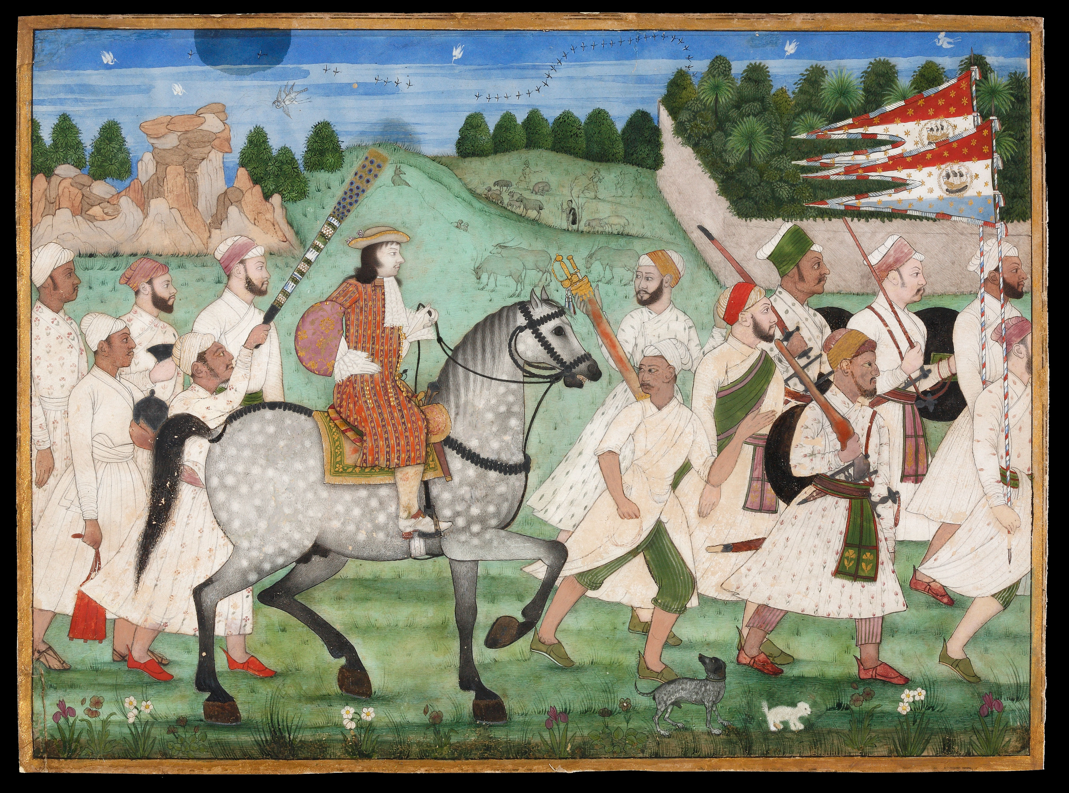 IMAGE 8: Creating relationships with local South Asian rulers was an important strategy for East India Company servants. ‘Miniature. “A Mounted Prince Hunting with a Falcon”, India, Deccan, Golconda [?]; 1680-1700, Leaf: 29.9 × 19.8 cm’. Description: “Although it was painted in the period just around the time when Golconda – the last of the independent Deccan states – was forced to surrender to the Great Mughal Aurangzeb in 1687, this miniature still features the splendor and intense colors that characterized earlier painting from this region. … The splendidly rendered prince reflects the formal portraiture of Mughal Delhi that at this point had also made its mark in the Deccan, but the radiant colors of the textiles against the stallion’s refined, light-blue tone reveals the painter’s southern origins. … In the distance, behind a diminutive city, the army is marching with horses, elephants, and camels, fluttering banners, ensigns, kettledrums, and trumpets. … the men are also accompanied by two angels, one holding a sword, the other a trumpet. There is no information at present about the identity of the artist and the elegant prince, but the painting’s fascinating richness of detail and high quality are indisputable.” Inv. no. 13/2015. © The David Collection