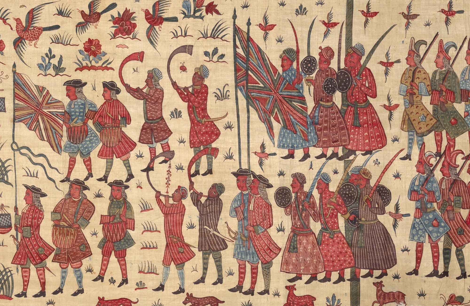 IMAGE 14-26: A South Asian visual depiction of East India Company alliances with South Asian states and rulers. ‘Hanging [Cloth] depicting a European conflict in South India’, before 1763. Description: “This multilayered tableau of a battle is the most spectacular, complex, and complete surviving example of a rare chintz history painting. The hanging may celebrate the successful 1760–61 English siege of Pondicherry, on the southeast coast of India, headquarters of the French East India Company. The English forces (under a stylized Union Jack) are shown fighting alongside allied local soldiers. Indian regiments appear to be distinguished by dress—Muslims with long gowns and bushy beards, the Hindus in skirt cloths—indicative of the complex web of regional alliances forged by the European trading companies. Two ships (upper register, center) flying a simplified version of the triple fleur-de-lis and crown, the insignia of the French East India Company flag from 1756, represent the defeated French.” Culture: Indian, Coromandel Coast, for British market. Medium: Cotton, plain weave (drawn and painted, mordant and resist dyed). Dimensions: Overall: 116 3/4 × 103 in. (296.5 × 261.6 cm). Credit Line: Purchase, Harris Brisbane Dick Fund and Louis V. Bell Fund; Larry and Ann Burns and Brett and Sara Burns Gifts, in honor of Austin B. Chinn; and Austin B. Chinn and Joseph Conforti and Douglas Jakubowski Gifts, 2014. Accession Number: 2014.88. The Metropolitan Museum of Art, New York. Public Domain.