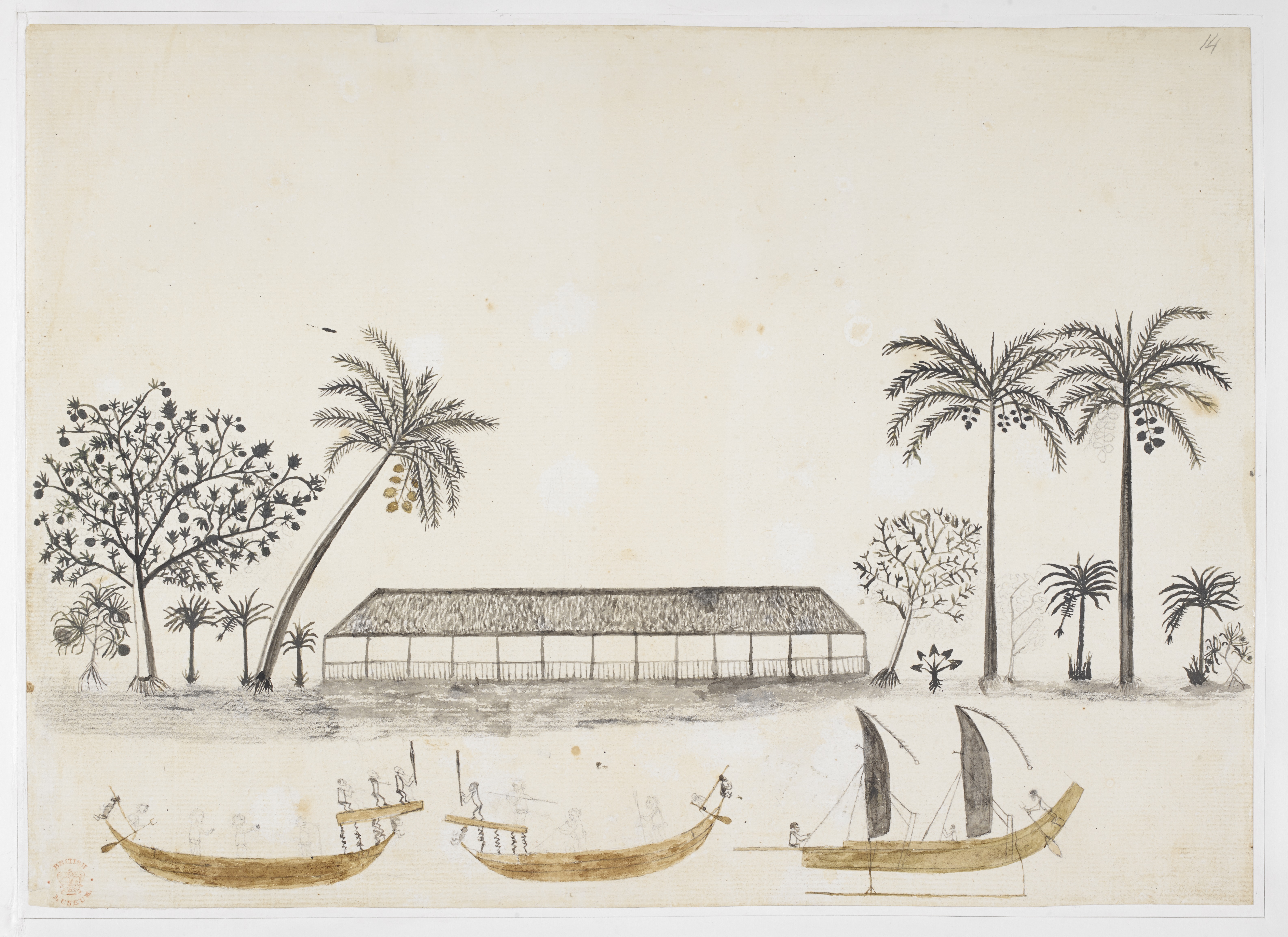 IMAGE 14: What are the challenges and opportunities of reconstructing indigenous peoples’ perspectives of the sea and of European engagement with their cultures? Tupaia, ‘Longhouse and Canoes in Tahiti’, in Drawings, in Indian ink, illustrative of Capt. Cook’s first voyage, 1768 -1770, chiefly relating to Otaheite and New Zealand, by A. Buchan, John F. Miller, and others. Large Folio. Bequeathed by Sir Joseph Banks, Bart. Created: 1769. Format: Pen and Indian Ink, Watercolour, View. Creator: Tupaia. Description: “Tupa’ia, a navigator and priest from Raiatea, assisted Captain James Cook on his first voyage to the South Pacific (1769–71). The drawing shows a traditional longhouse in Tahiti situated on a beach fertile with different types of trees and plants (pandanus, breadfruit, banana, coconut and taro can all be identified). In the foreground three canoes are being navigated by local men. The double-sailed vessel on the left is a sailing canoe and the other two boats are used for war. The bow and stern of each war canoe is decorated with a wooden ‘tiki’ sculpture (a carved image of a god or ancestor). Warriors armed with spears stand on platforms raised from the sterns of both vessels ready for battle.” Shelfmark: Add MS 15508. Held by © British Library.