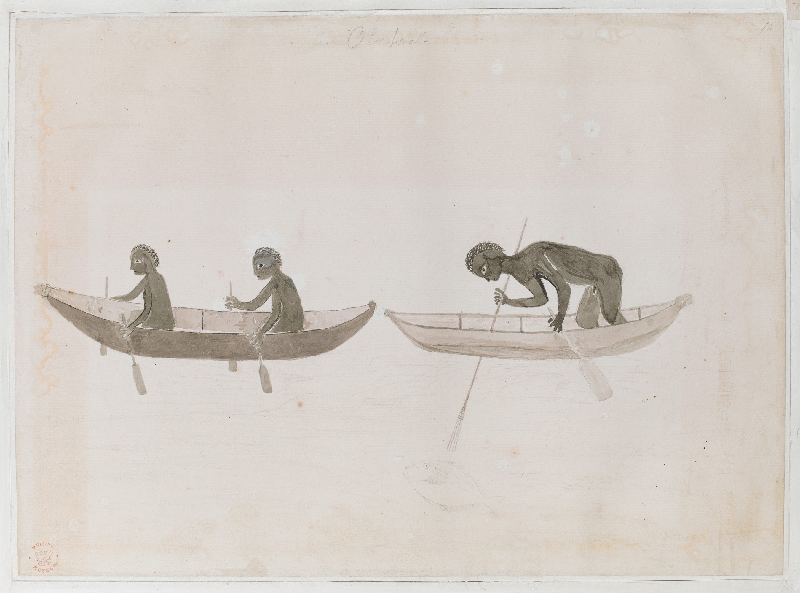 IMAGE 15: Forms of sea travel were diverse around the world, revealing the deep and varied ways in which different societies engaged with the sea. Description: ‘Indigenous Australians in bark canoes, drawing by Tupaia’. Published: 1770. Format: Drawing. Creator: Tupaia. Description: “Tupaia’s drawing shows two canoes, in one of which a man is using a three-pronged spear to catch a fish. Banks described how, as the Endeavour entered Botany Bay, he observed ‘four small canoes’ under the southern headland: ‘In each of these was one man who held in his hand a long pole with which he struck fish, venturing with his little imbarkation almost into the surf. These people seem’d to be totaly engag’d in what they were about: the ship passd within a quarter of a mile of them and yet they scarce lifted their eyes from their employment.'” Shelfmark: MS 15508 f. 10. Held by © British Library. Public Domain.