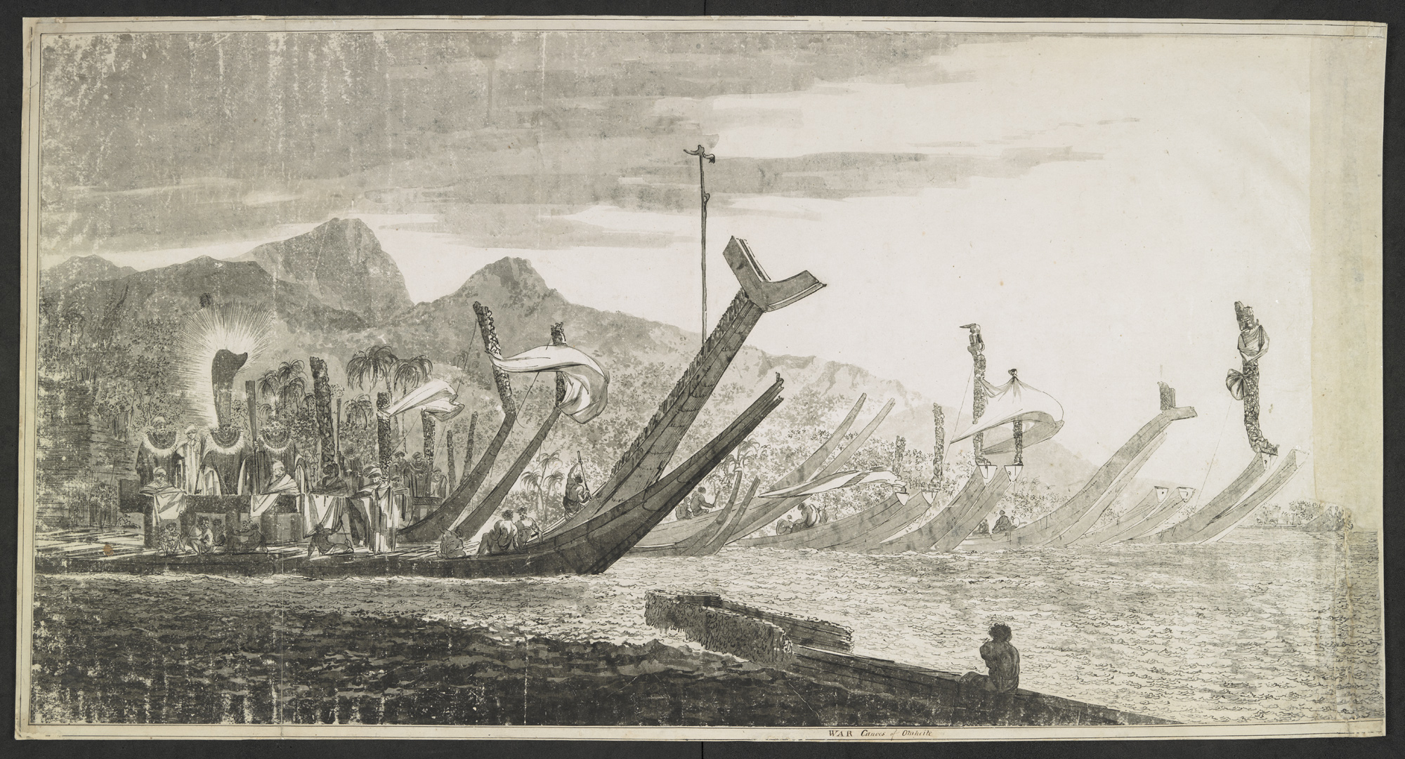 IMAGE 16: How did Europeans view non-European societies, for example, through their ships? William Hodges, ‘Tahitian War Canoes’, in A COLLECTION Of large Drawings in Indian ink, made by Wm. Hodges, during the second voyage of Capt. Cook, in 1772-1774, viz., Fayal; -Tonga Tabu or New Amsterdam;-Mallicolo;-Resolution Harbour, in St. Christina, one of the Marquesas;-Savage Island;- Sandwich Island;-Alietea;-War Canoes of Otaheite ;-Otaheite; New Caledonia. Created: 1774, Tahiti. Format: Drawing. Creator: William Hodges. Description: “William Hodges made these drawings of Tahitian war canoes during James Cook’s second voyage. One shows a fleet drawn up on shore at Pare, home of Tahitian chief Tu. Although ostensibly preparing for an expedition against the neighbouring island of Mo‘orea, the display was probably also intended to impress the British, and to help to form an alliance.” Shelfmark: Add MS 15743 f.8. Held by © British Library. Public Domain.