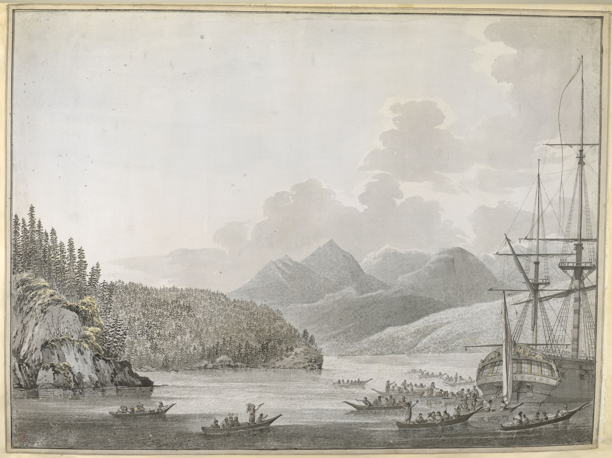 IMAGE 17: To what extent was cultural encounter, as manifested through the arrival of a ship in a new location, a ‘performance’? John Webber, NINETY drawings, some in Indian ink, some colored, executed by J. Webber, during the third voyage of Captain Cook in the South Seas, in the years 1777-1779 ; contained in two large Portfolios. Presented, in 1843, by the Lords Commissioners of the Admiralty. Created: 1777-78. Format: Pen and ink, watercolor, view. Description: “The views made during Captain Cook’s third expedition are John Webber’s best-known works. After being spotted by the famed botanist, Daniel Solander, who recommended him to the Admiralty, Webber was given the task of compiling a visual record of the voyage of the Resolution and the Discovery from 1776–80. A number of the drawings were later engraved and published in A Voyage to the Pacific Ocean in June 1784. … Cook’s third voyage reached Nootka Sound in April 1778 while searching for the Northwest Passage. Webber’s view shows the native residents of Yuquot in canoes surrounding the Resolution.’” Shelfmark: Add MS 15514, f.10. Held by © British Library. Public Domain.