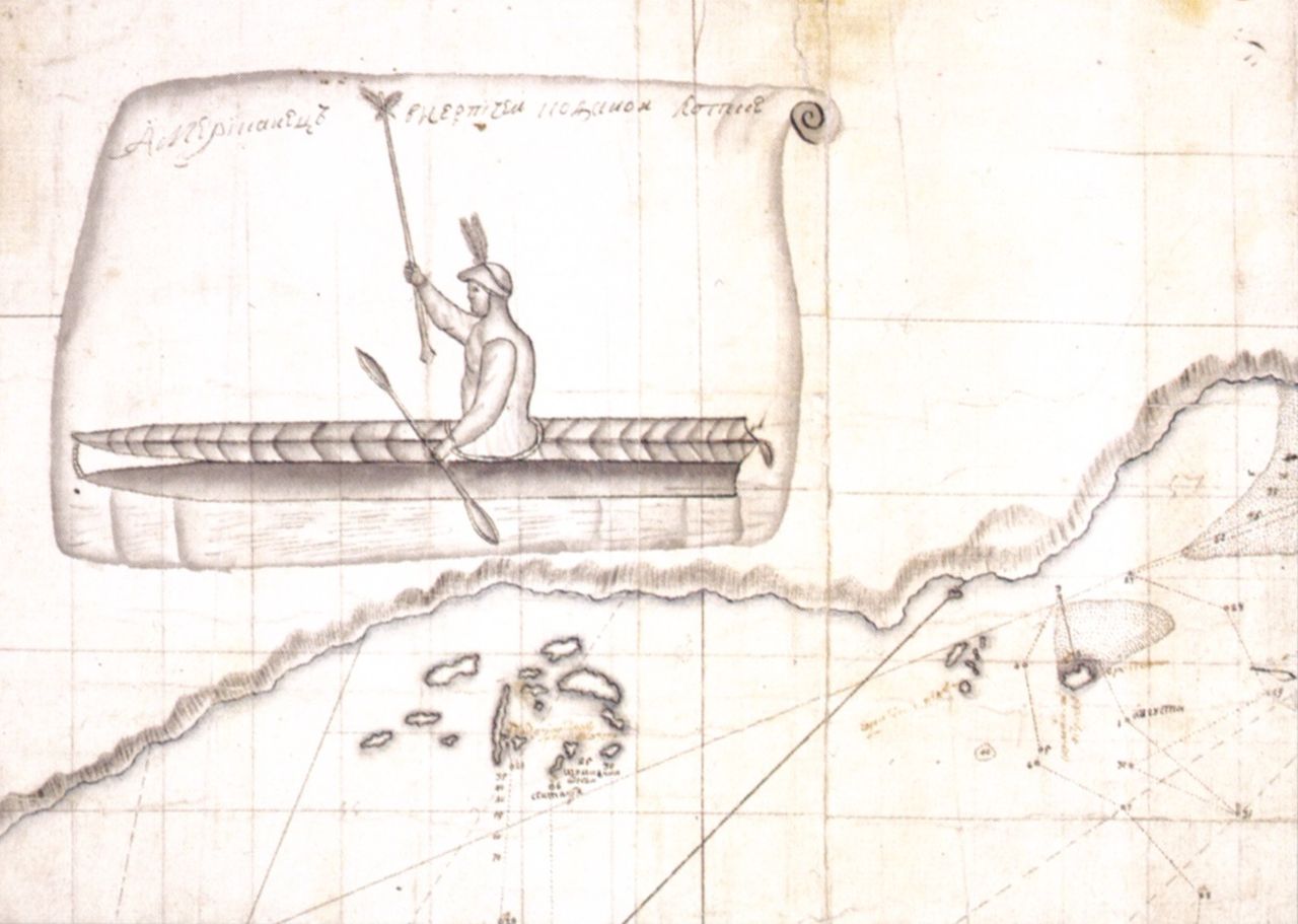 IMAGE 18: Sven Larsson Waxell, ‘Bering’s first encounter with Aleuts at Shumagin Island. Drawing by Sven Waxell, the mate of Bering’s ship St. Peter’, circa 1741. Downloaded from Wikimedia Commons. Public Domain.
