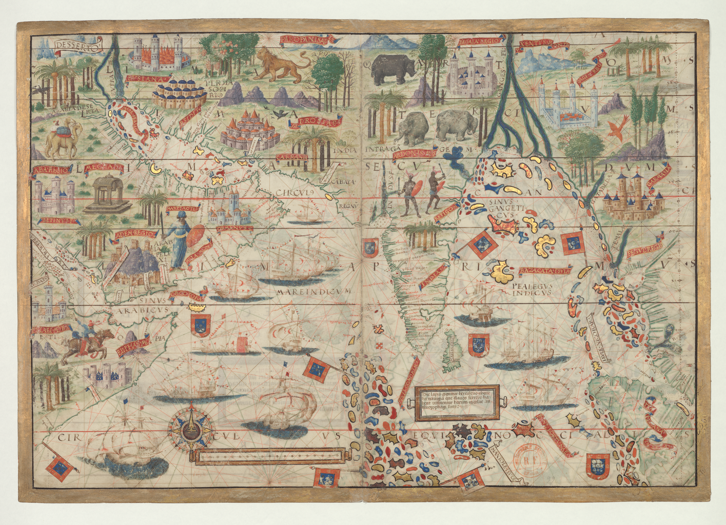 IMAGE 4: In what ways does cartography reveal the ways in which the sea was a space of cultural encounter? Northern Indian Ocean, in Atlas nautique du Monde, dit atlas Miller, 1519, fol. 3r. Notice n° : FRBNF40887480. Description from the World Digital Library: “The map presented here is from the Miller Atlas in the collections of the National Library of France. Produced for King Manuel I of Portugal in 1519 by cartographers Pedro Reinel, his son Jorge Reinel, and Lopo Homem and miniaturist António de Holanda, the atlas contains eight maps on six loose sheets, painted on both sides. The maps were richly decorated and illuminated by António de Holanda, a Dutch native who had been in Portugal for nearly ten years. … For other parts of the world about which Europeans still had limited knowledge, geographic details are drawn from the cartographer’s imagination or informed by views that originated with Ptolemy. One side of the map (folio 3 recto of the atlas) shows the Northern Indian Ocean with Arabia and India. The equator is shown; other features include the Red Sea, Gulf of Aden, Persian Gulf, Ganges Delta, and the Nicobar Islands. … Both sides of the map have ornamental gold leaf, red banners with gold lettering for place-names, heraldic shields and flags, and vessels flying either the Portuguese Cross of the Order of Christ or the Ottoman crescent…” Bibliothèque nationale de France, downloaded from the World Digital Library.