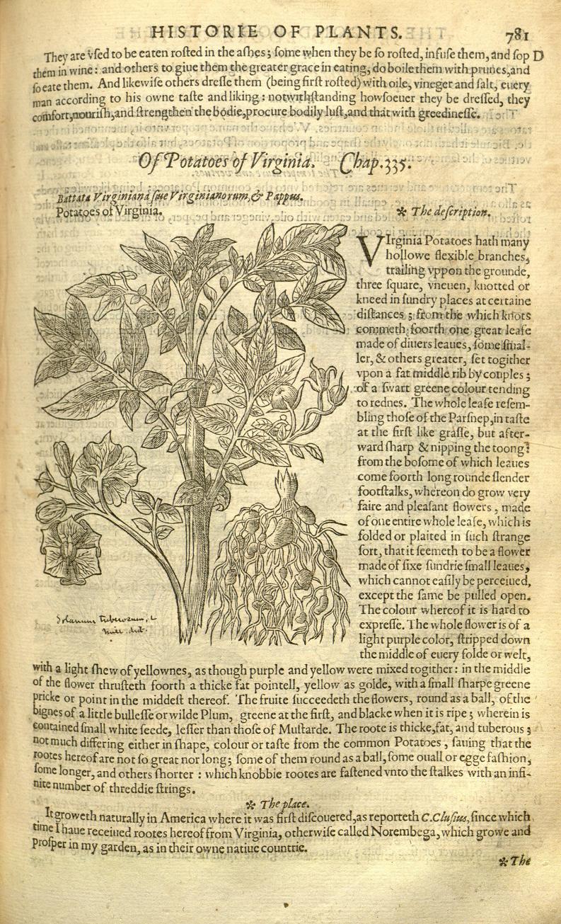 IMAGE 10: Potatoes were an important plant which crossed the Atlantic from the New World in the early modern period, as part of the ‘Columbian Exchange’. John Gerard, The Herball, or, Generall historie of plantes (London: Imprinted by John Norton, 1597). Description: “There had been an earlier written description (but with no illustration) of the plant in Gaspard Bauhin’s Phytopinax of 1596. The Dibner Library of the Smithsonian Libraries has this first edition. The Biodiversity Heritage Library has digitized the copy in the Peter H. Raven Library, Missouri Botanical Garden”. Downloaded from Julia Blakely, ‘Celebrate the Potato’, 12 September 2016, Smithsonian Libraries Blog: Unbound.
