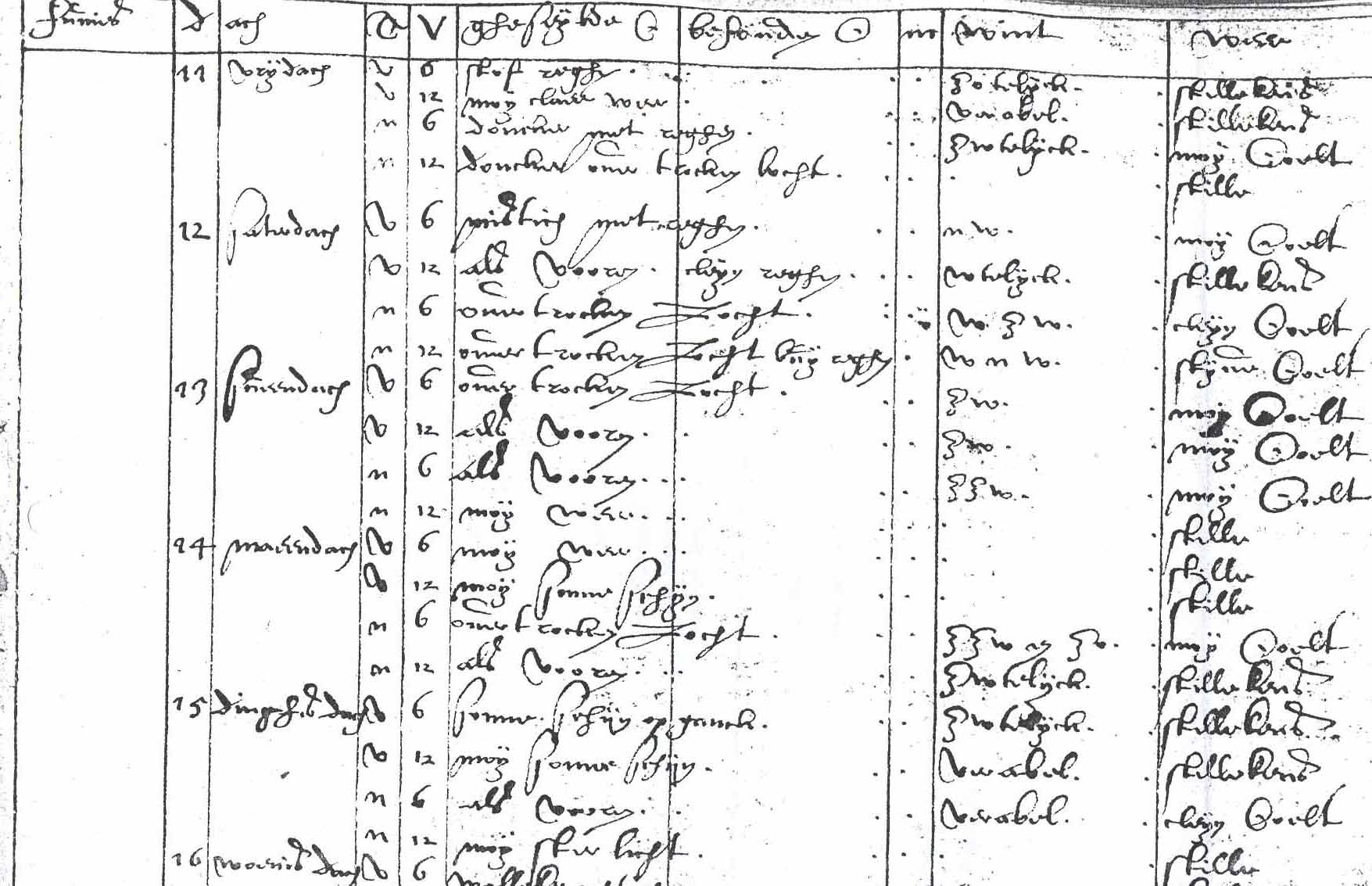 IMAGE 23: How can historical sources like ship logs shed light on the weather and climate of the past? ‘Part of a ships log kept by Philips Grimmaert on the ship Zeelandia, June 1599’. National Archives, The Hague, East India Company, no. 54, downloaded from Adriaan M.J. de Kraker, ‘Historical climatology, 1950-2006: An overview of a developing science with a focus on the Low Countries‘, Belgeo: Belgian Journal of Geography 3 (2006), 307-338 (Figure 1).