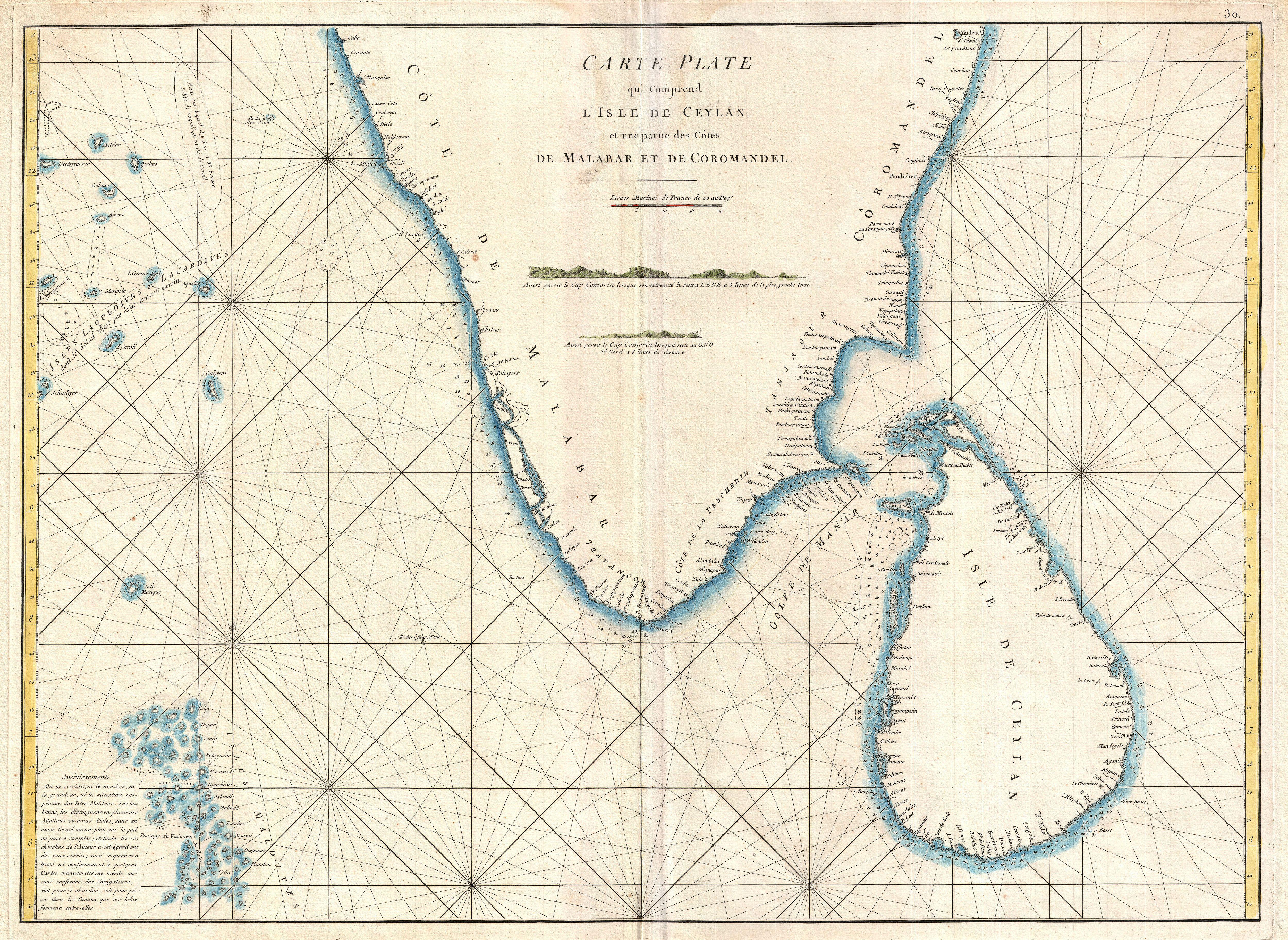 IMAGE 1: Carte plate qui comprend l’Isle de Ceylan, et une partie des Côtes de Malabar et de Cormandel, engraved by De La Haye for Jean-Baptiste d’Après de Mannevillette’s Neptune Oriental (Paris; Brest, 1775). 27 in (68.5 cm) x 20 in (50.8 cm). Downloaded from Wikimedia Commons.