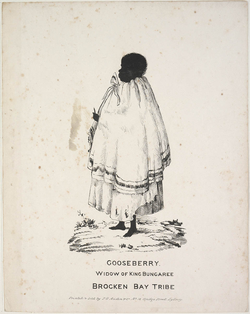 IMAGE 7: ‘Cora Gooseberry, Widow of King Bungaree, Brocken Bay Tribe.’ From the collections of the State Library of New South Wales [a1114024 / SAFE/PXA 615, 34] published by J.G. Austin & Co. No. 12 Bridge Street, Sydney as W.H. Fernyhough’s “A series of twelve profile portraits of Aborigines of New South Wales”, Sydney 1836. Caption and Images from Wikimedia Commons. Public Domain.