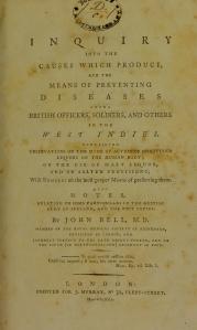 IMAGE 22: In what ways was medicine entangled with the British military? Title Page, John Bell, An Inquiry into the Causes Which Produce, and the Means of Preventing Diseases among British Officers, Soldiers, and Others in the West Indies (London: Printed for J. Murray, 1791). Physical description: xv, 180 pages ; 22 cm (8vo). Biographical Note: “John Bell MD, formerly surgeon of the 94th and 5th regiment of foot (promoted in 1784 according to London Medical Journal, 1784, Volume 5).” Shelfmark: EPB RAMC /BEL. Wellcome Collection. Public Domain.