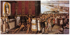 IMAGE 28: ‘El primer milagro (“the first miracle”) depicting the Virgin of Guadalupe healing a Nahua actor after an accident in a September 26, 1531, mock battle between Toltec-Mexica and Chichimecs as part of the procession up the causeway between Mexico City and Tepeyac. Attributed to the workshop of José Júarez (1653)’, in Collision of Worlds, Plate 8. Thank you to Prof. Carballo for providing this image. Museo de la Basilica de Guadalupe.