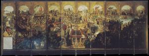 IMAGE 33: Remembering the Conquest on a Japanese-inspired folding screen. ‘Biombo, Conquest of Tenochtitlan’, 1675-1700, unknown creator. Current Location: Museo Franz Mayer, Mexico City, Mexico. Description: “This folded screen presents a then-and-now view of Mexico City. On this side, the city is in the throes of the fiery wars of conquest in 1520-21. On the other is the peaceful 17th-century city, with the Viceregal palace at its center….The painter depicted the same space of Mexico City on both sides of the biombo. On this side, the notable events of the conquest unfold. The conquest narrative begins at the upper right, as Hernán Cortés is welcomed into Tenochtitlan by the emperor Moteuczoma. Behind his palanquin is an even grander one, presumably to seat Cortés. Along the central axis is the main plaza where fierce fighting took place for control of the city. Beneath is a scene showing the assassination of Moteuczoma. The painter makes clear that it was angry Aztecs, not Spaniards, who were responsible. At one point during the war, the Spanish were routed from the city. The dark lower right corner obscures their flight, the low point of Spanish fortunes in the war….While its original setting is not known, the biombo most likely adorned a large room in a wealthy urban home in Mexico City. When unfolded to reveal its two distinct views of the city, the biombo may well have become a conversation piece—stimulating talk of the city and its past….The biombo offers one picture of how elites in New Spain understood the wars of Conquest, and their interpretation of these events. Instead of a foreign usurper, Hernán Cortés is shown as a welcomed savior. And Aztecs, not Spaniards, are shown as responsible for the assassination of Moteuczoma, an act which brought autonomous indigenous rule to an end.” Dana Leibsohn and Barbara E. Mundy, Vistas: Visual Culture in Spanish America, 1520-1820, Vistas Gallery. Photo Credit: Museo Franz Mayer.