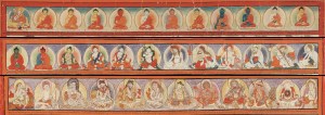 August 13, 2020August 13, 2020 IMAGE 4: Detail, ‘Top Three Registers: Medicine Buddhas & Early Rishis’, from ‘Blue Beryl Medical Compositions (charts) commissioned by the 3rd Desi Sanggye Gyatso (1653-1705)’. Date Range: 1700 – 1799. Collection: Private. Description: ‘The overall image above is created by layering fifteen strips of register found at the top of the first fifteen Blue Beryl compositions. …. The first topic, Medicine Buddha and the Medicine Buddha Sutras, are a religious teaching and group of several texts. Initially it is using the idea of a Medicine Buddha and healing as a metaphor for suffering as sickness and healing with correct methods as the Dharma teachings of Buddhism. It was only in Tibet in the 11th and 12th century that Medicine Buddha and the Medicine Buddha Sutras began to be directly linked to medicine and the new concept of Tibetan Medicine. The linking of Medicine Buddha and Tibetan Medicine can be found in the Four Medical Tantras and in the later Yutog Nyingtig. Both of these texts are classifies as ‘terma’ Revealed Treasure teachings of the Nyingma Tradition of Tibetan Buddhism. … The top register begins with the 5th Dalai Lama followed by the Eight Medicine Buddhas, and the five activity emanations of the Medicine Buddha. Those are followed by four Indian deities which include Indra and Prithi Devi, twelve Indian rishis and six further Indian gods including Brahma, Mahadeva, Vishnu, Kumara, Ganesha and Ramana. The gods and rishis are also repeated in the depiction of the Medicine Buddh[a] Realm. They surround the central figure and each has a name inscription.’ Downloaded from Himalayan Art Resources, Item No. 35810. © 2020 Himalayan Art Resources Inc. Images Provided Courtesy of Private Collections.