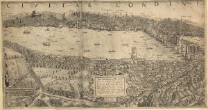 IMAGE 6: Early modern port cities like London were important centers of global trade. ‘Bird’s eye view of the City of London from Hampstead to St. Dunstan in the East’, 1600. Engraving. After John Norden. Downloaded from Barrie Cook, ‘Historical city travel guide: London, late 16th century’, 10 July 2020, The British Museum Blog.