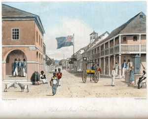 IMAGE 8: ‘Harbour Street, Kingston’, in James Hakewill, A Picturesque Tour of the Island of Jamaica, from Drawings Made in the Years 1820 and 1821 (London, 1825; reprinted, Kingston, Jamaica and San Francisco, 1990), plate 4. Copy in Archives and Special Collections, University of Miami Library. Description: “[View] looking eastward. James Hakewill (1778–1843) was an English architect known for illustrated publications. Several of his works relating to Jamaica can be found in T. Barringer, G. Forrester, and B. Martinez-Ruiz, Art and Emancipation in Jamaica: Isaac Mendes Belisario and his Worlds (New Haven: Yale Center for British Art in association with Yale University Press, 2007), passim.” Identifier: HAKE6. Downloaded from Slavery Images: A Visual Record of the African Slave Trade and Slave Life in the Early African Diaspora. Image: Public Domain. Metadata: Creative Commons Attribution-NonCommercial 4.0 International (CC BY-NC 4.0).